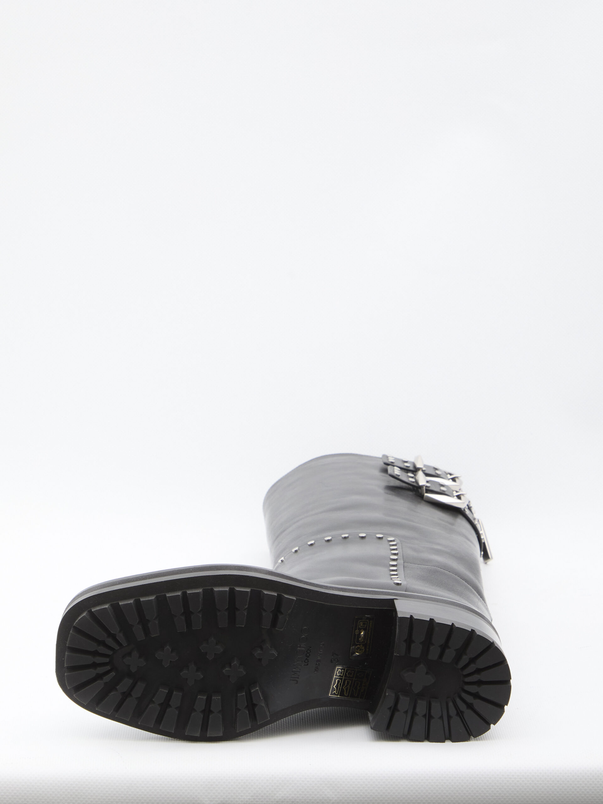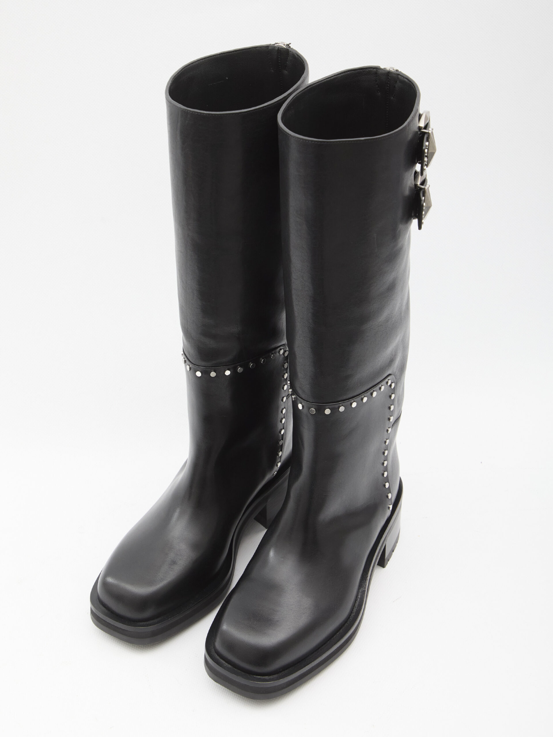 Tube boot in shiny black calfskin leather. Features a slightly squared toe, back zip closure with two buckle straps, flat brass stud detailing, and a rubber sole. Knee-high length. Dust bag included. Any subtle variations or markings on the leather are not to be considered imperfections, but rather natural characteristics that attest to the authenticity and uniqueness of the material.