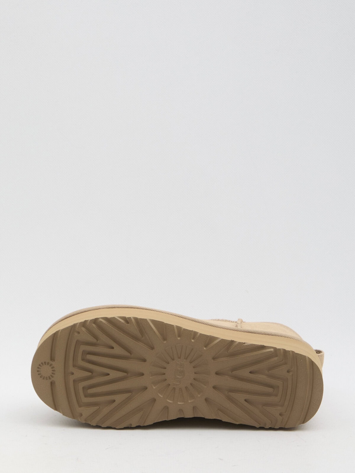 Classic Ultra Mini Platform women’s boots in beige sand-colored suede with UGGplush wool blend lining. They feature rear loop tab, UGG logo at the back and Sugarsole platform sole. Any leather imperfections are not to be considered manufacturing defects, but a peculiarity of the material.