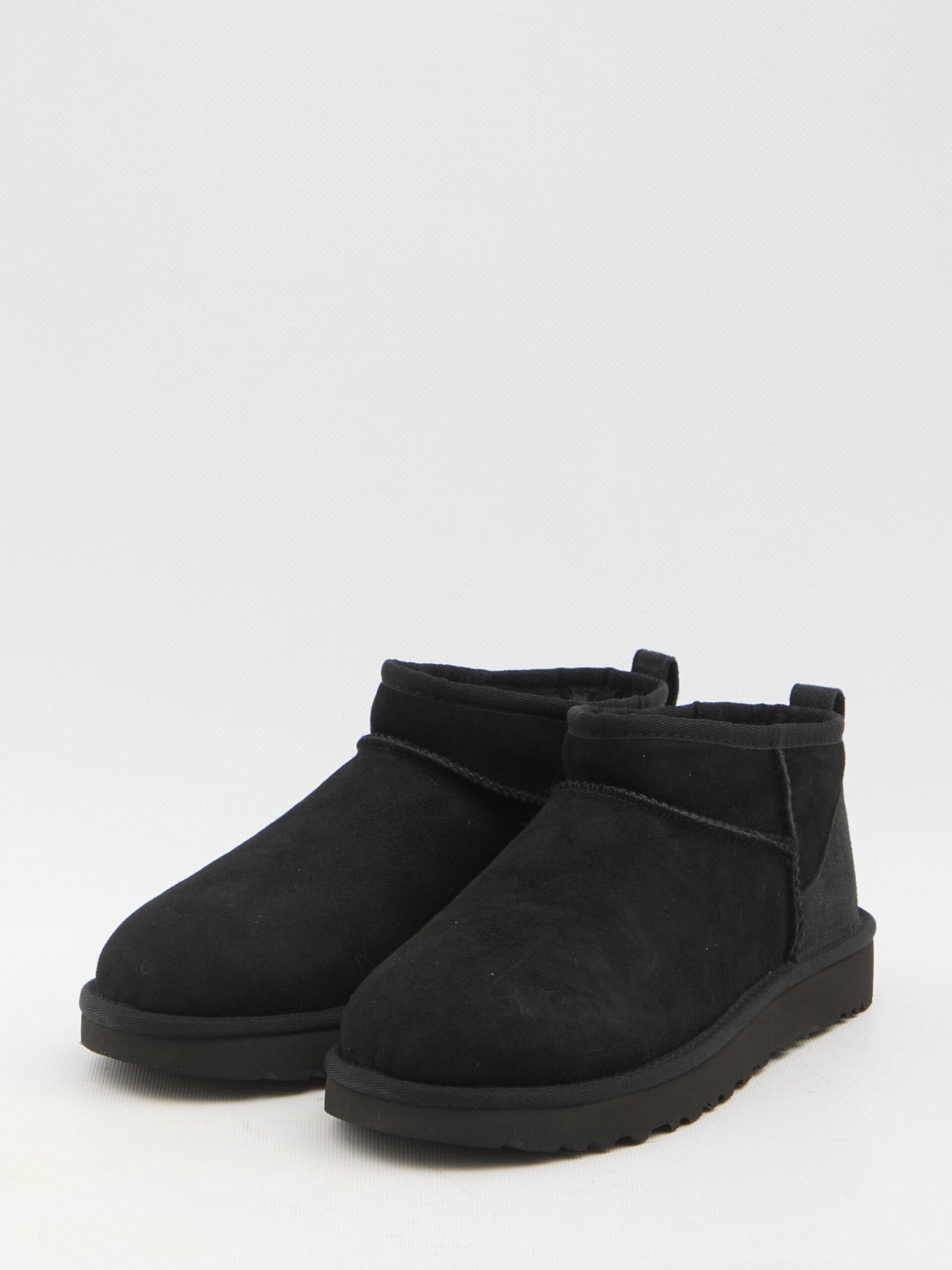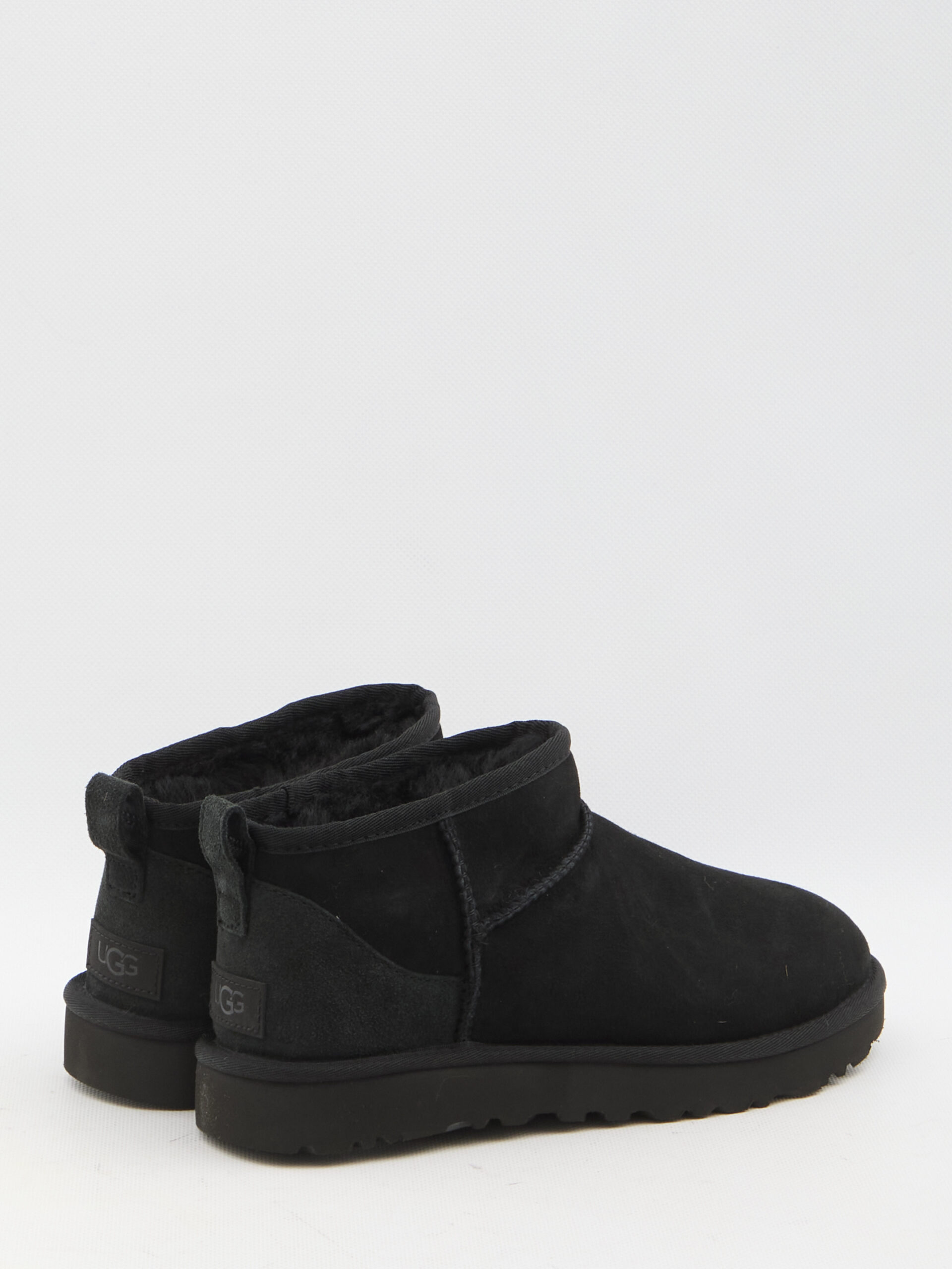 Ugg Classic Ultra Mini women’s boots in black suede with UGGplush wool blend lining. They feature UGG logo on the back, rear loop tab and Sugarsole sole. Any leather imperfections are not to be considered manufacturing defects, but a peculiarity of the material.