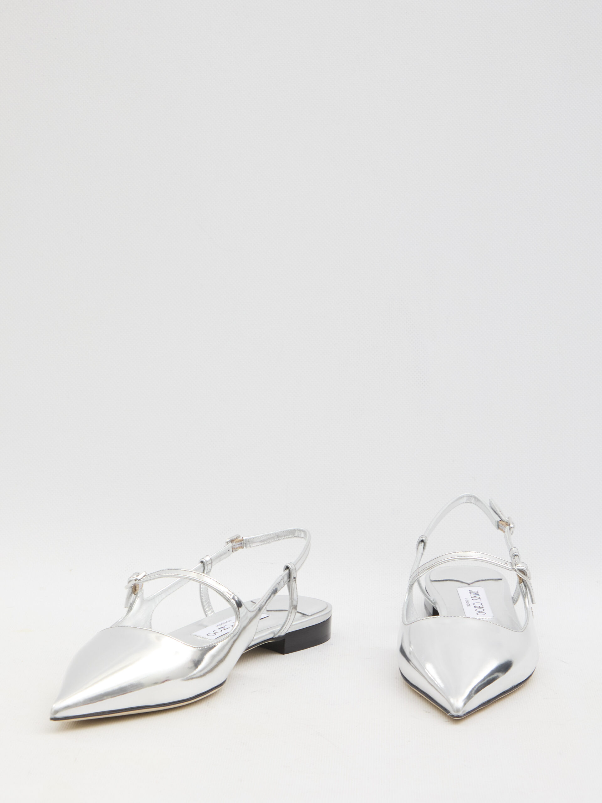 Didi ballerina flats in silver patent leather with a pointed toe. They feature an elasticized slingback strap with adjustable buckle, an adjustable buckle strap on the front, a logo label on the insole, leather lining, and a leather sole. Dust bag included. Any imperfections in the leather are not defects but a characteristic of the material.