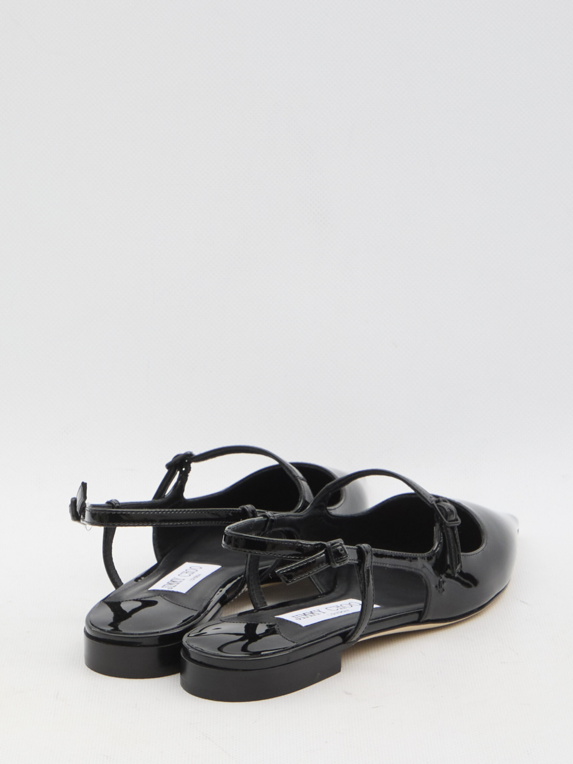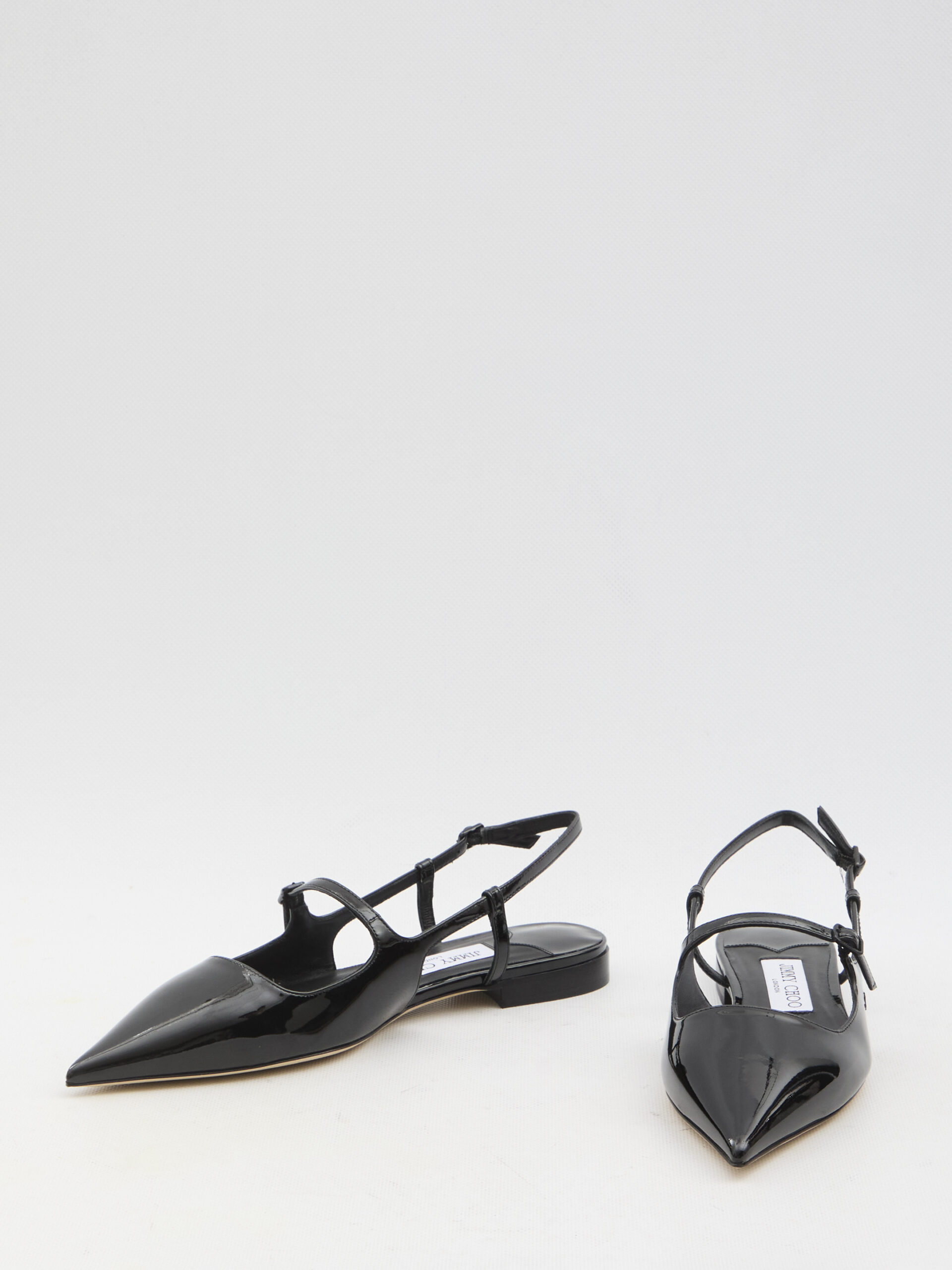 Didi ballet flats in black patent leather with a pointed toe. They feature an elasticized slingback strap with adjustable buckle, adjustable buckle strap on the front, leather lining, and leather sole. Dust bag included. Any imperfections in the leather are not considered manufacturing defects but rather a characteristic of the material.