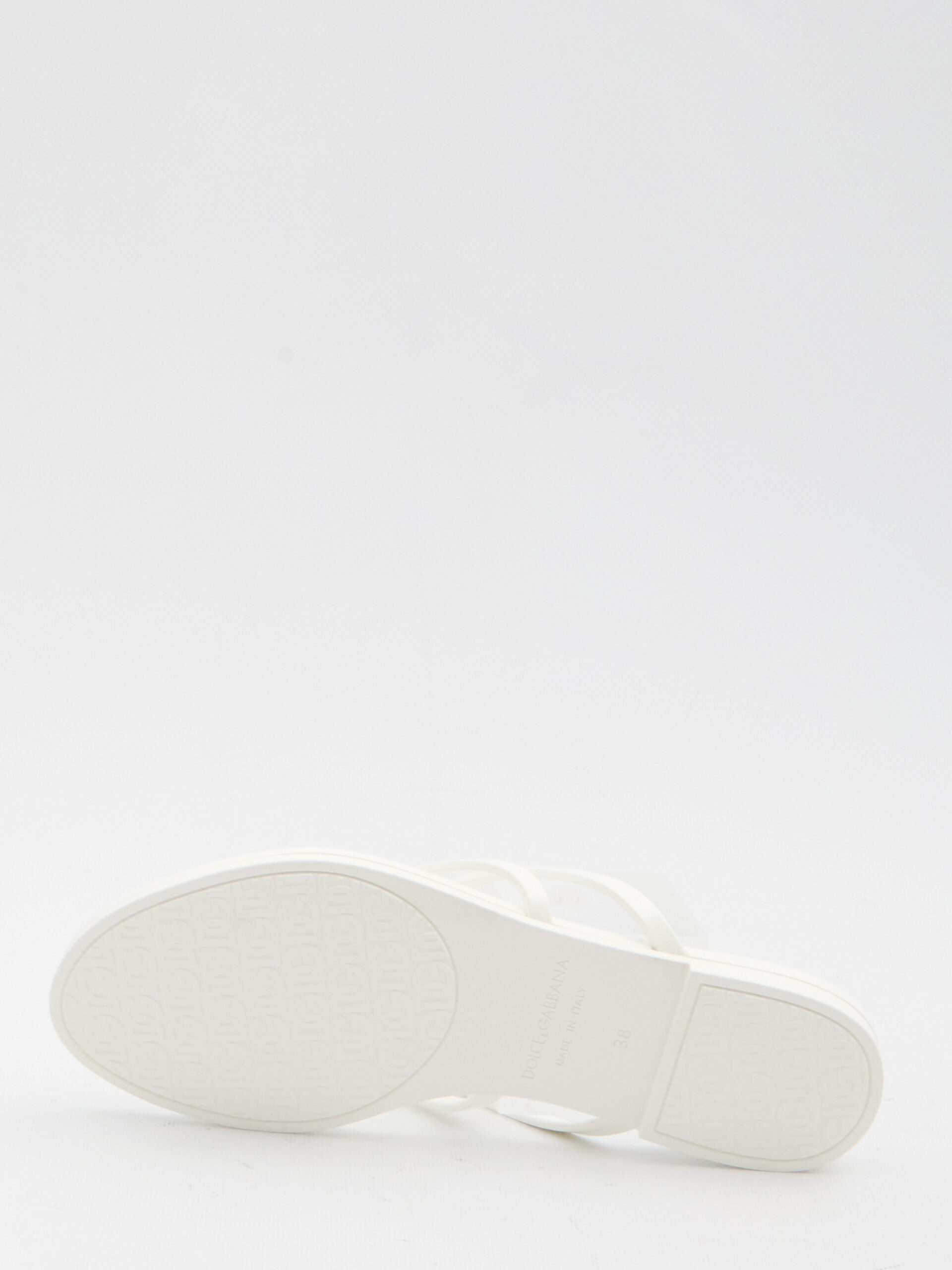 White rubber thong sandals with light gold-tone crossed DG logo hardware. Embossed rubber insole and round toe. Any slight rubber irregularities are not defects but a feature of the material. Dust bag included. Italian sizing, true to size.