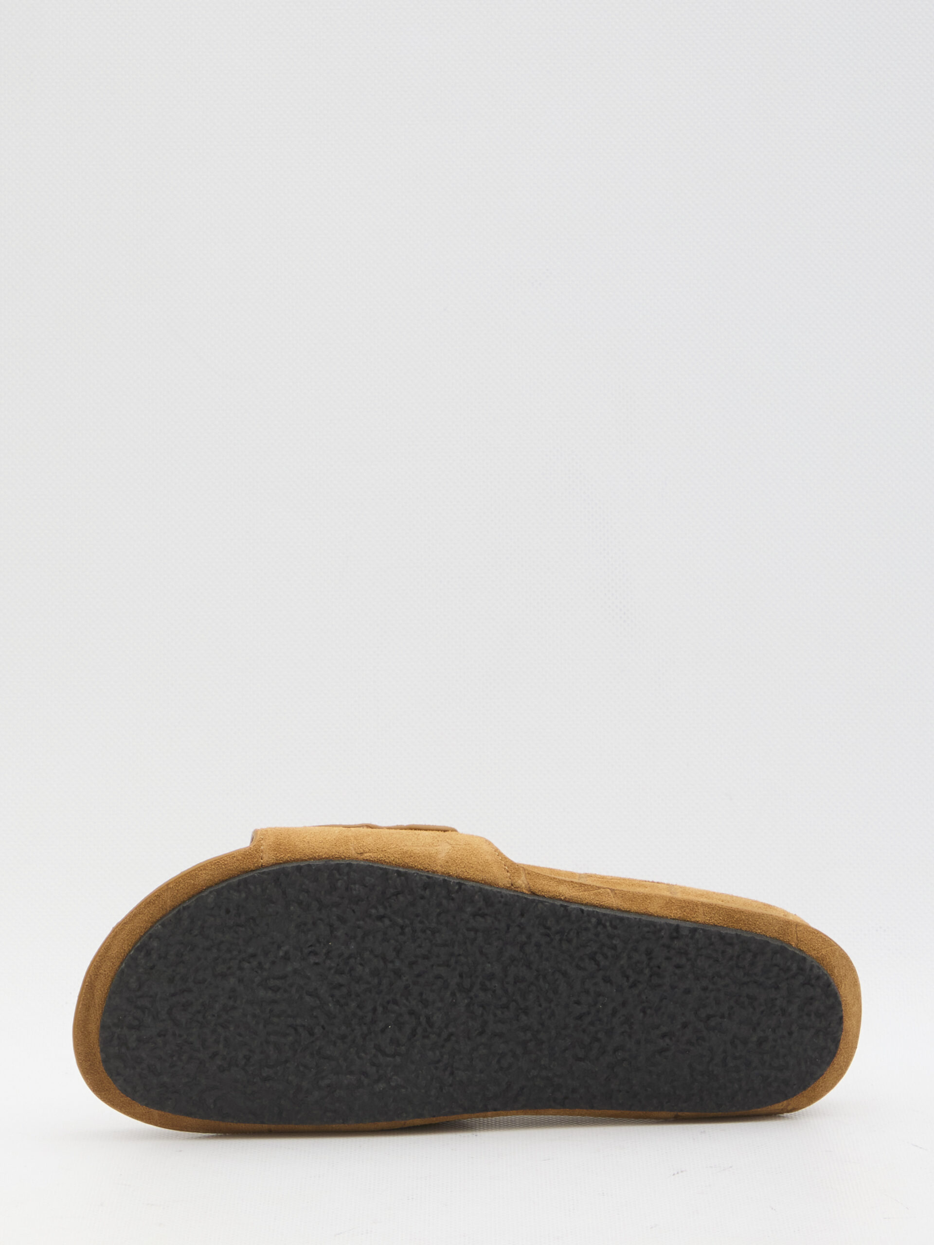 Moccasin-style sandals in camel-colored suede leather. They feature visible stitching, a round toe, an embossed logo on the leather insole, and a rubber sole. Dust bag included. Any imperfections in the leather are not considered defects but a characteristic of the material.