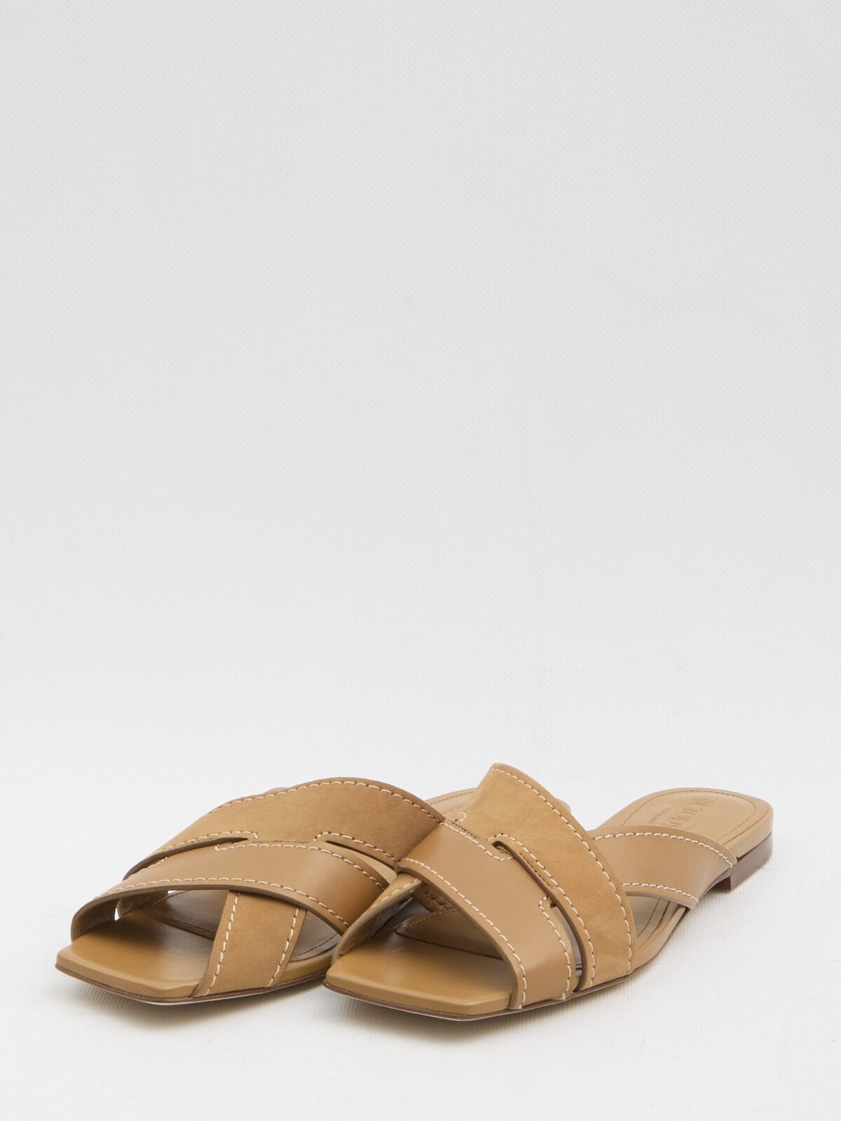 Brown smooth and suede leather flat sandal. It features crossed suede top straps, a leather insole, and a leather sole. Dust bag included. Any leather imperfections are not to be considered manufacturing defects, but a characteristic of the material.