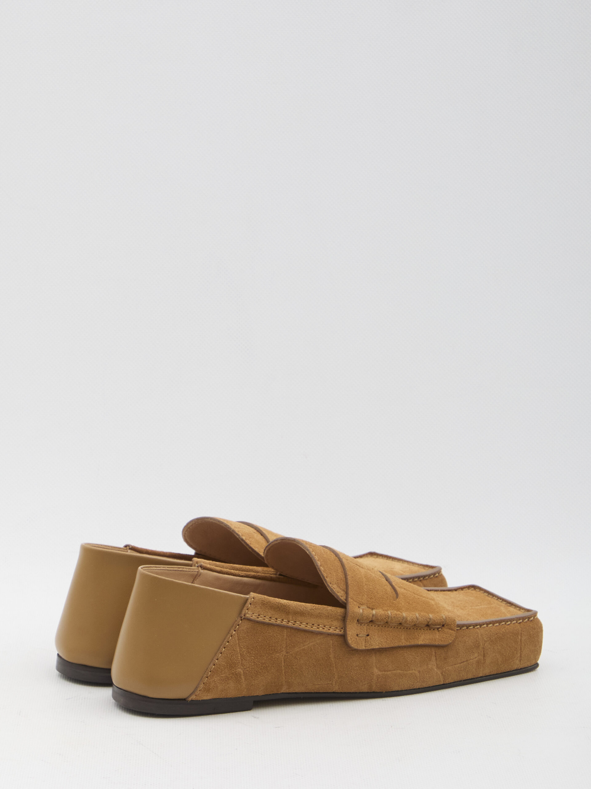 Carré loafers in camel embossed suede leather with crocodile effect and soft heels to be worn as folded mules. They feature a squared toe, visible stitching, embossed logo on the insole, and a leather sole. Dust bag included. Any imperfections in the leather are not to be considered manufacturing defects, but a peculiarity of the material.