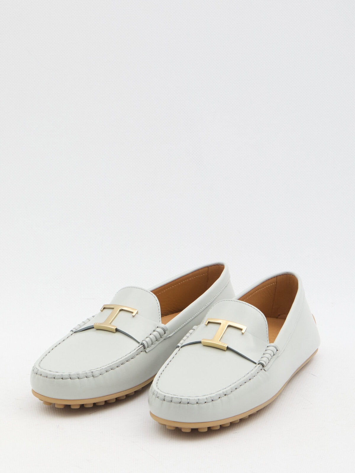 City Gommino moccasins in grey leather. They feature a metal T Timeless accessory with an engraved logo on the toe, visible stitching, a rubber studded detail on the heel, a leather insole with an embossed logo, and a rubber sole with studs. Dust bag included. Any imperfections in the leather should not be considered manufacturing defects but rather a characteristic of the material.