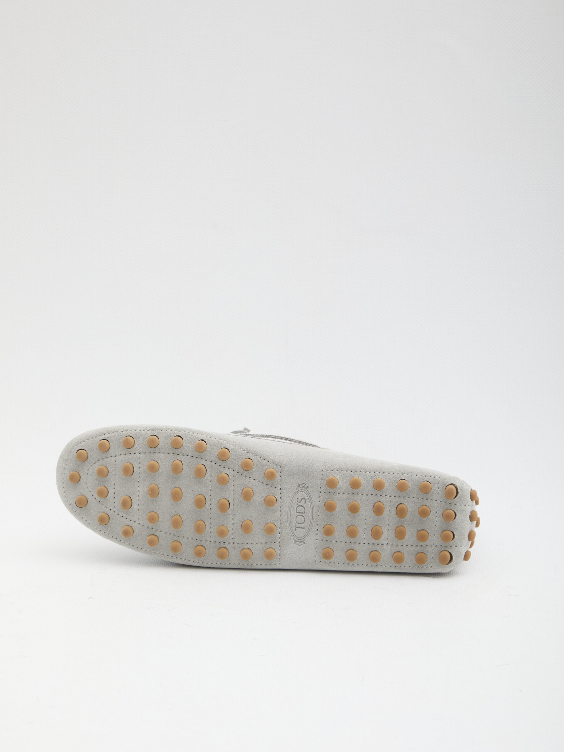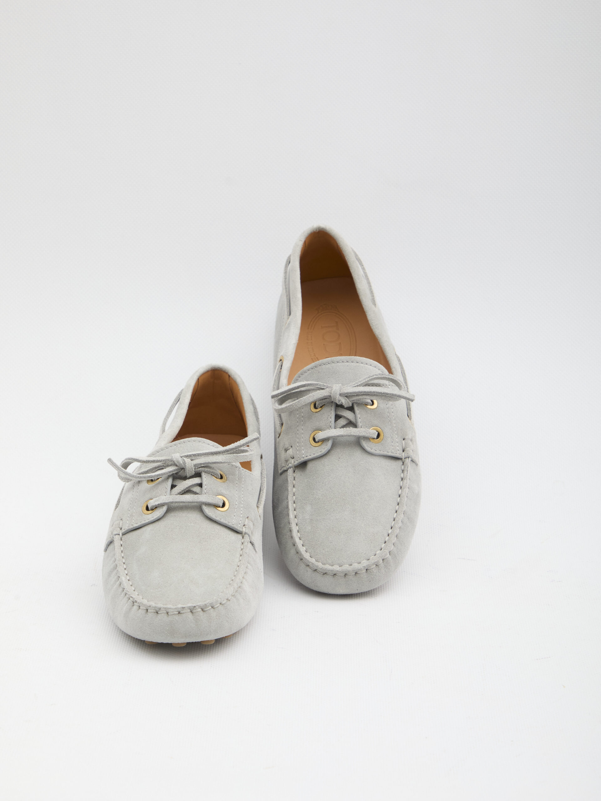 Grey suede loafers. Featuring an almond toe with tone-on-tone stitching, lace-up front closure, raised rubber stud detail on the back, leather lining, leather and rubber sole. Dust bag included. Any imperfections in the leather are not to be considered manufacturing defects, but a characteristic of the material.
