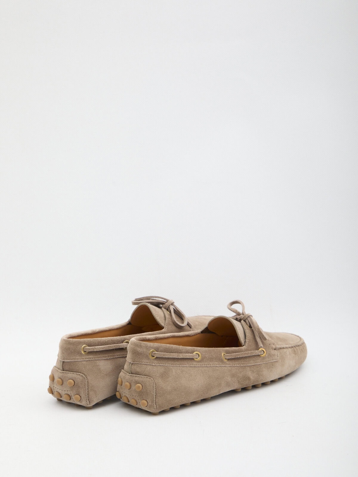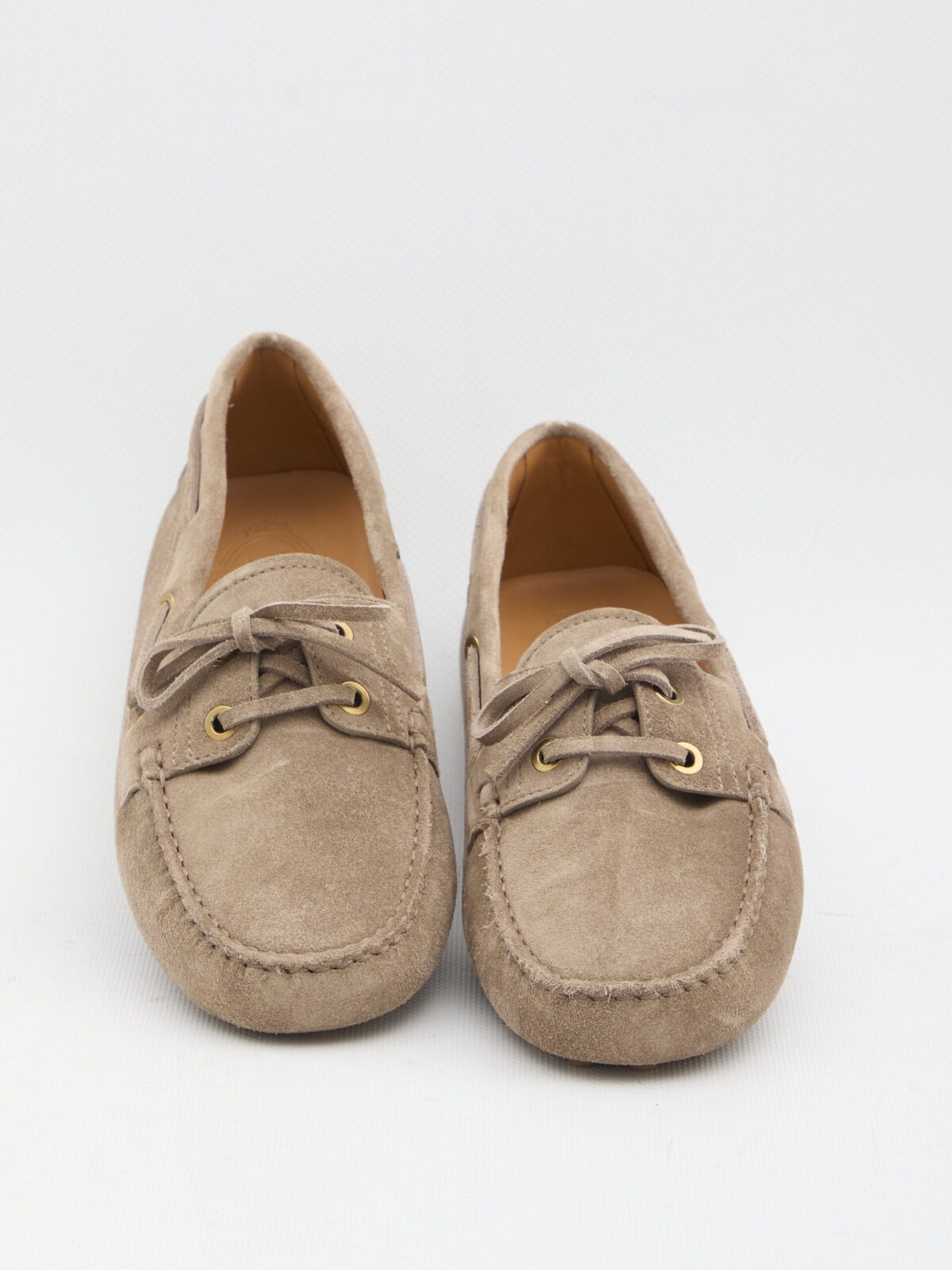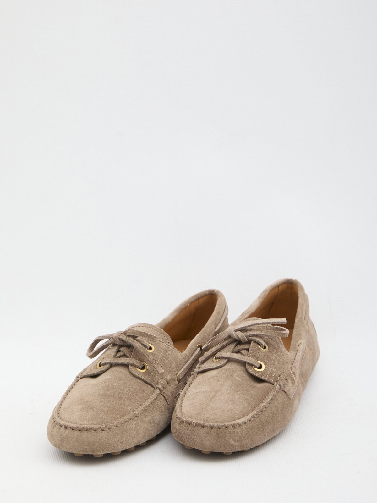 Taupe suede loafers. Featuring an almond toe with tone-on-tone stitching, lace-up front closure, raised rubber stud detail on the back, leather lining, leather and rubber sole. Dust bag included. Any imperfections in the leather are not to be considered manufacturing defects, but a characteristic of the material.