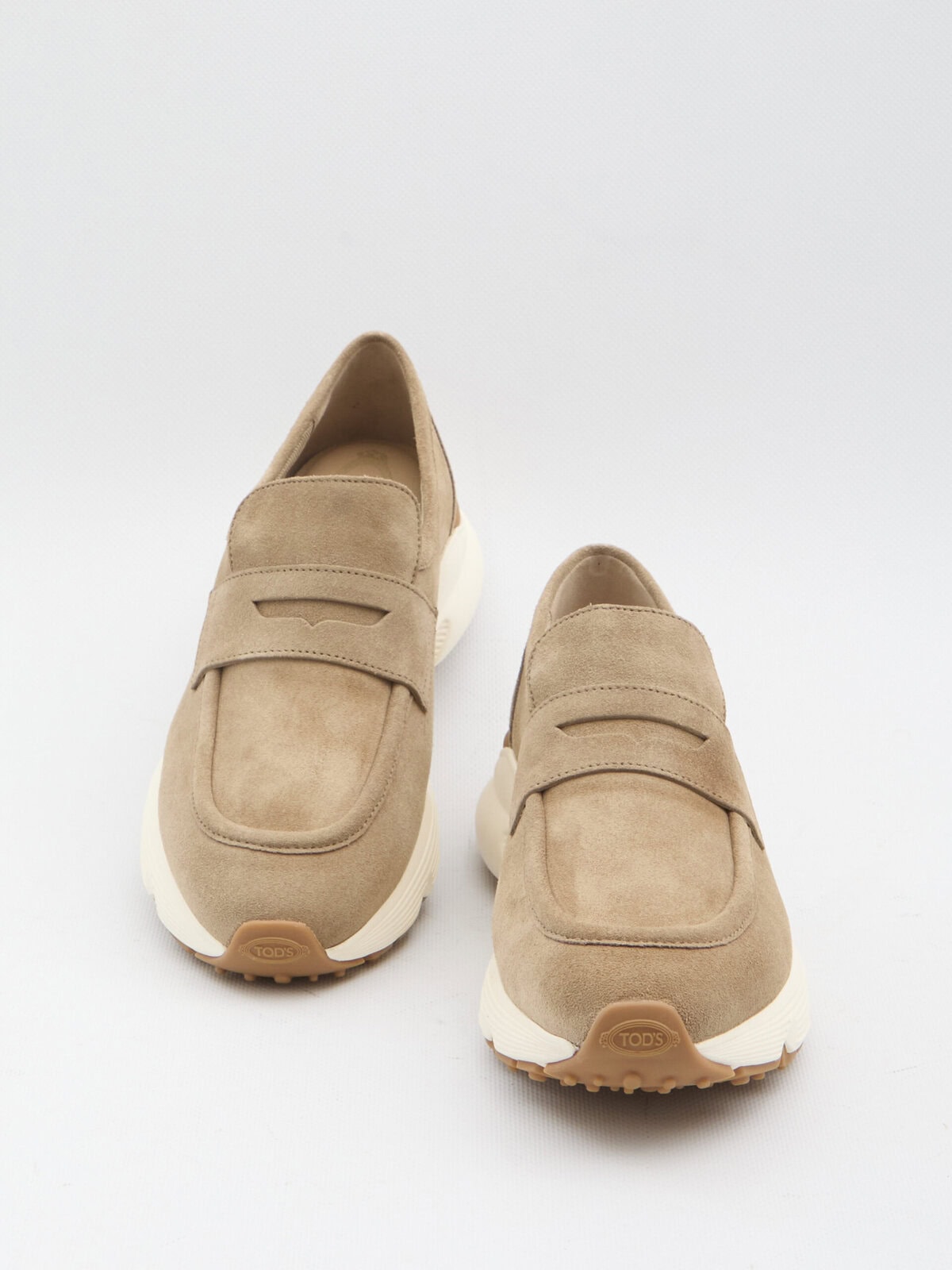 Beige suede calfskin sporty loafers featuring a round toe, tone-on-tone apron, and Tod’s signature on both the toe and the back. They also have a soft insole and a chunky rubber sole. Dustbag included. Any imperfections in the leather are not to be considered manufacturing defects but rather a characteristic of the material.