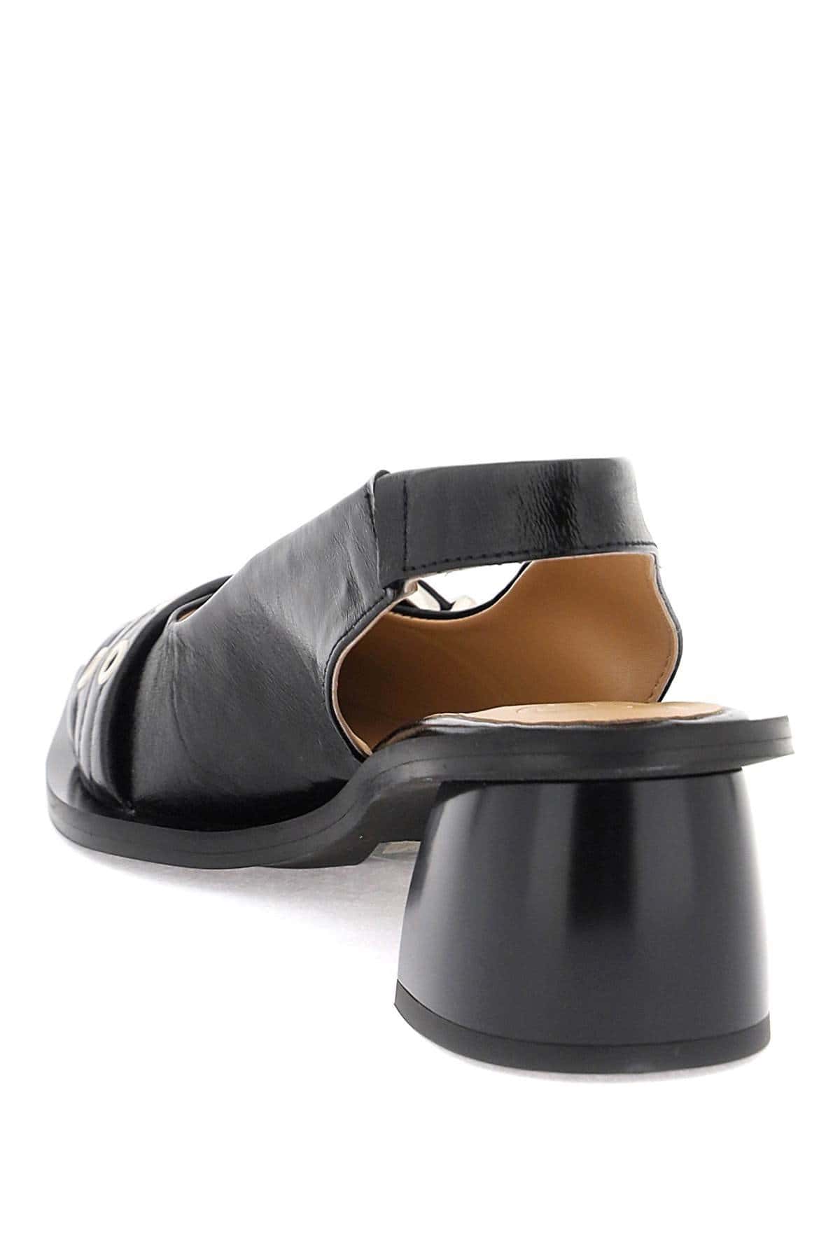 These Ganni pointed slingback decolleté s are made of shiny faux leather, embellished with a strap featuring eyelets and a large silver metal buckle on the toe. They stand out for their unique wide and curved heel and feature a faux leather insole with engraved logo and a rubber sole.