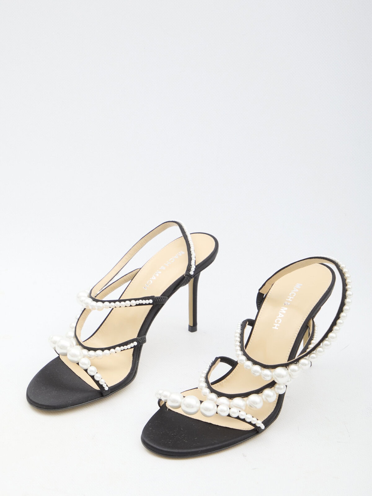 Sirene sandals in black satin with pearls. They feature round toe, straps, thin heel, leather insole and leather sole.