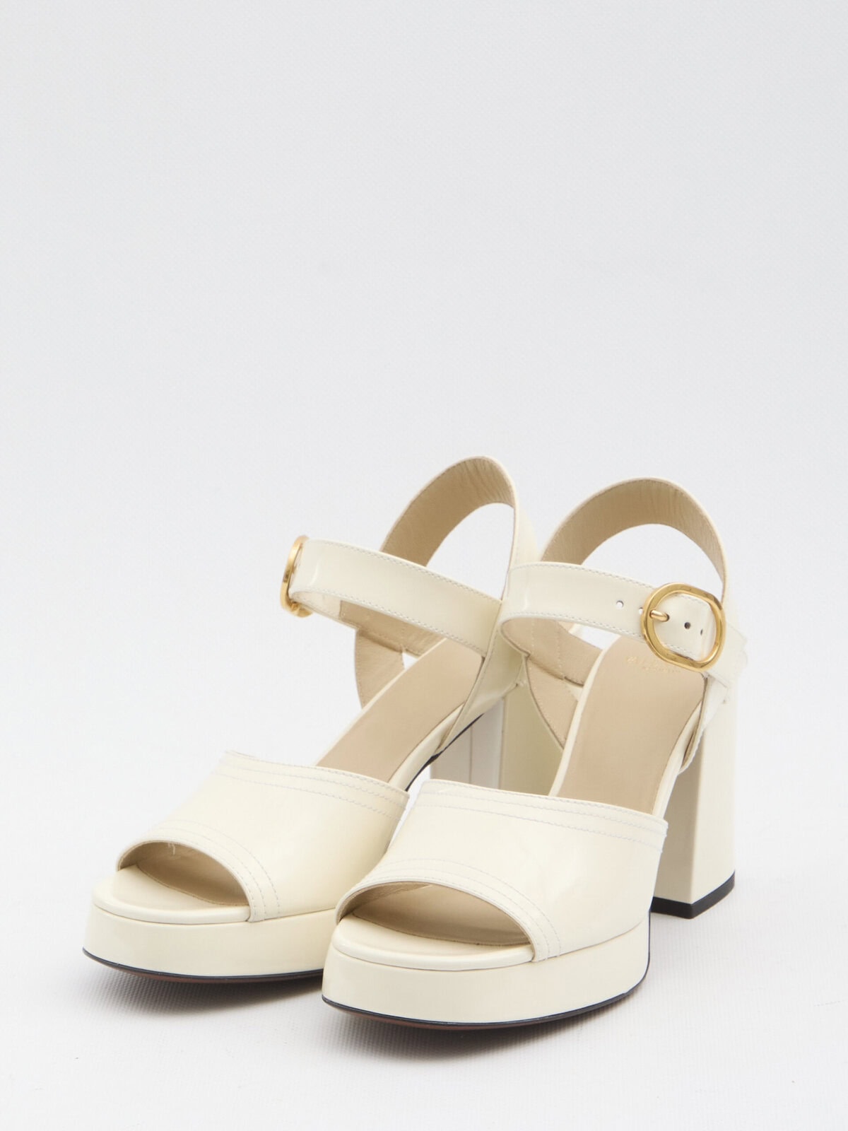 Fawcette platform sandals in ivory glossy calfskin leather. They feature a VLogo Signature metal detail in gold at the back, an adjustable buckle strap, a wide heel and platform, and a leather sole. Dustbag included. Any imperfections in the leather should not be considered manufacturing defects but rather a characteristic of the material.