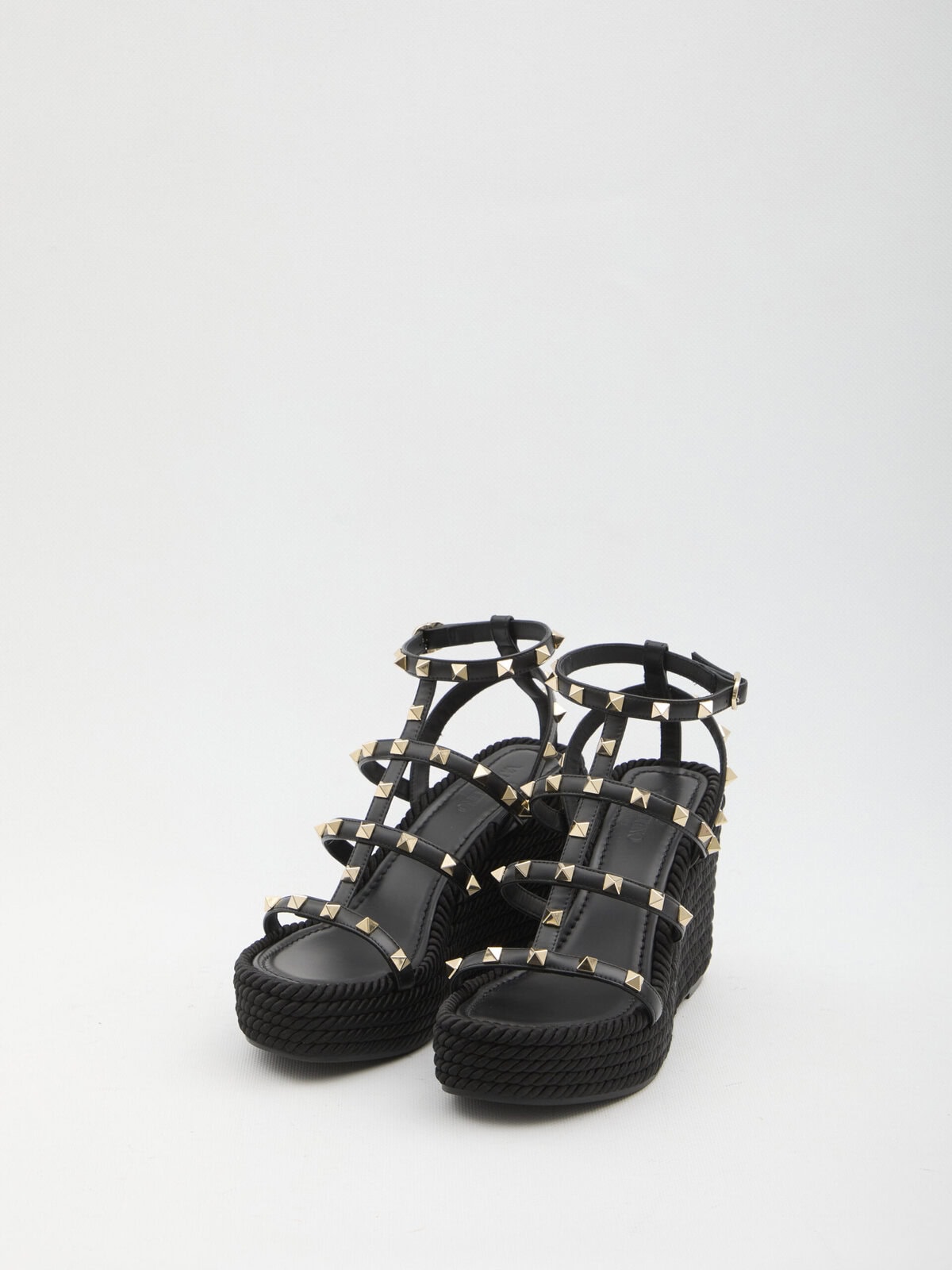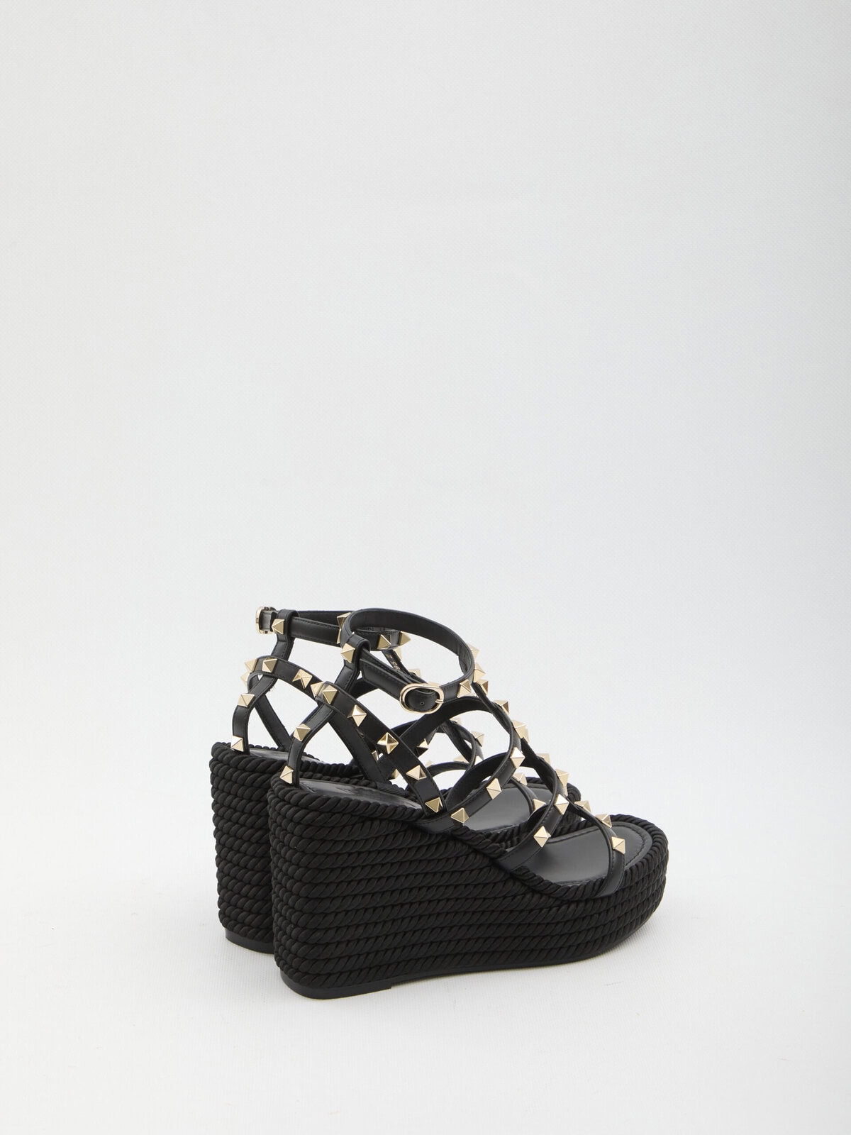 Sandals in black calf leather. They feature ankle straps with Rockstuds, a wedge covered with silk grosgrain, and a rubber sole. Dust bag included. Any natural markings or imperfections in the leather should not be considered manufacturing defects, but are characteristic of the material.