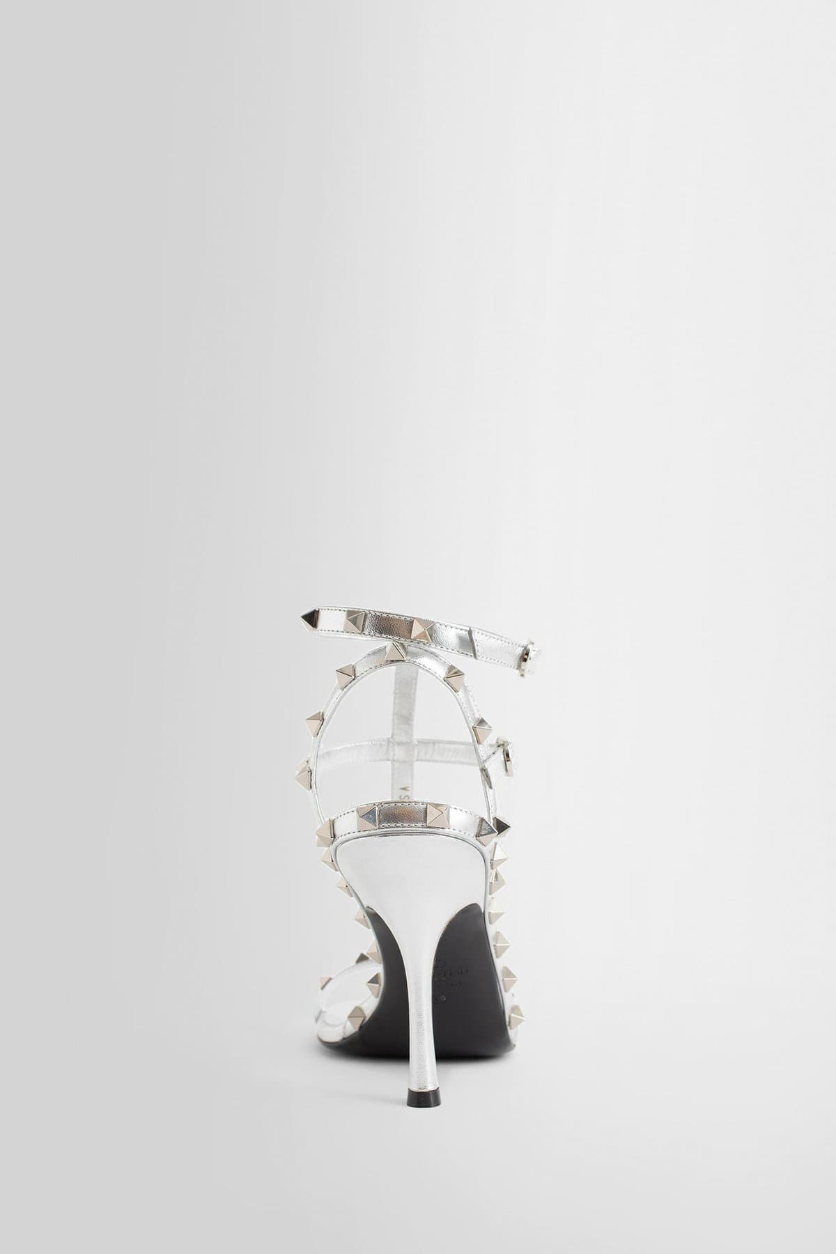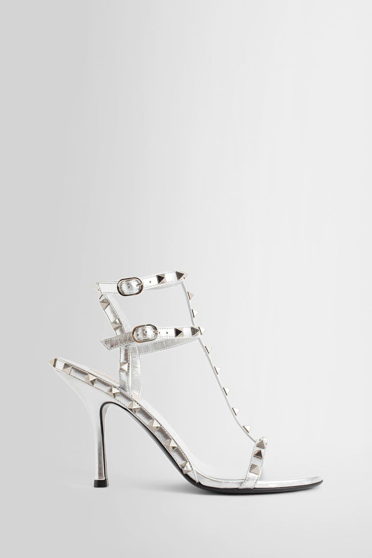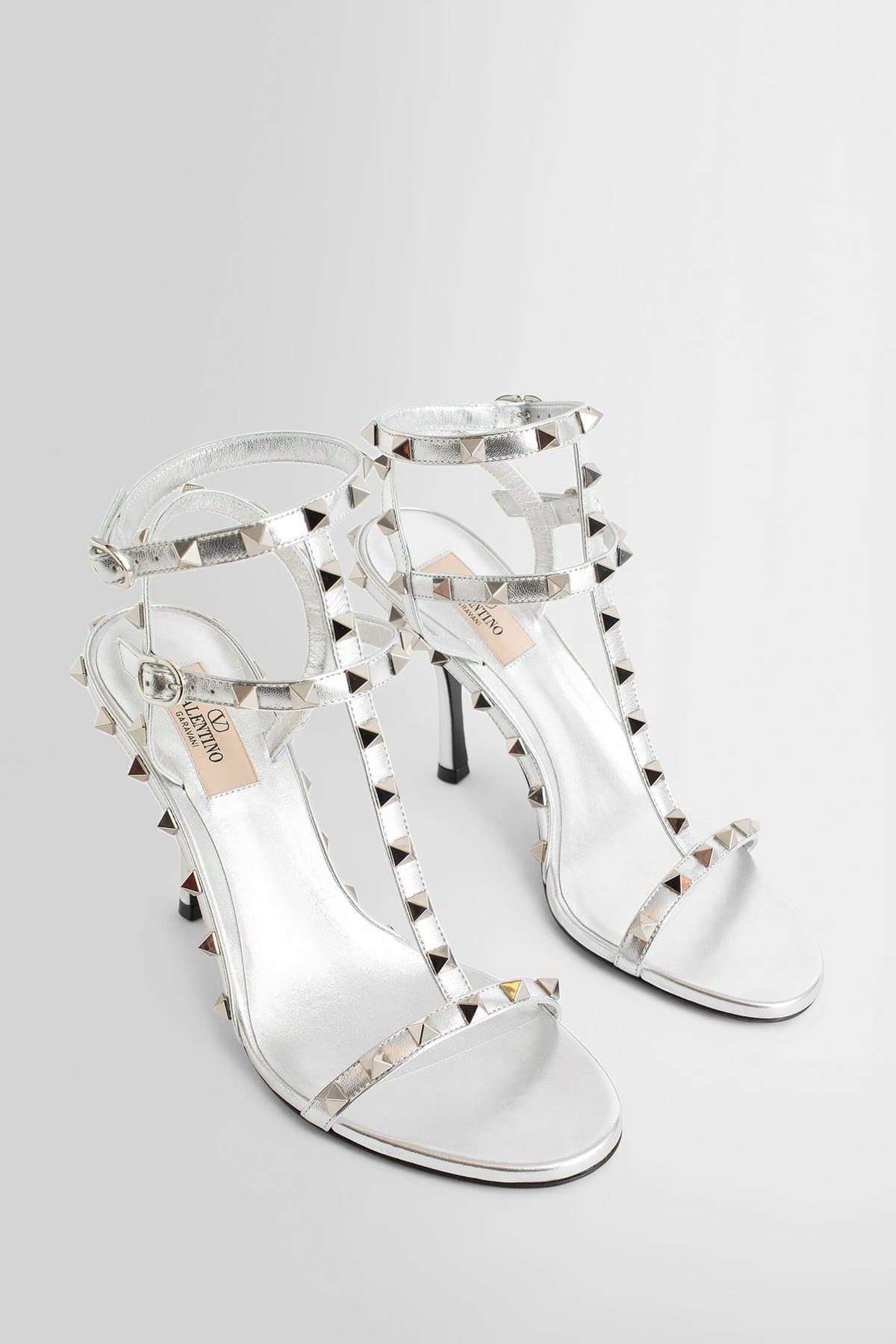 Argento Rockstud trim Front t-strap Buckled ankle straps Stiletto heel Leather sole