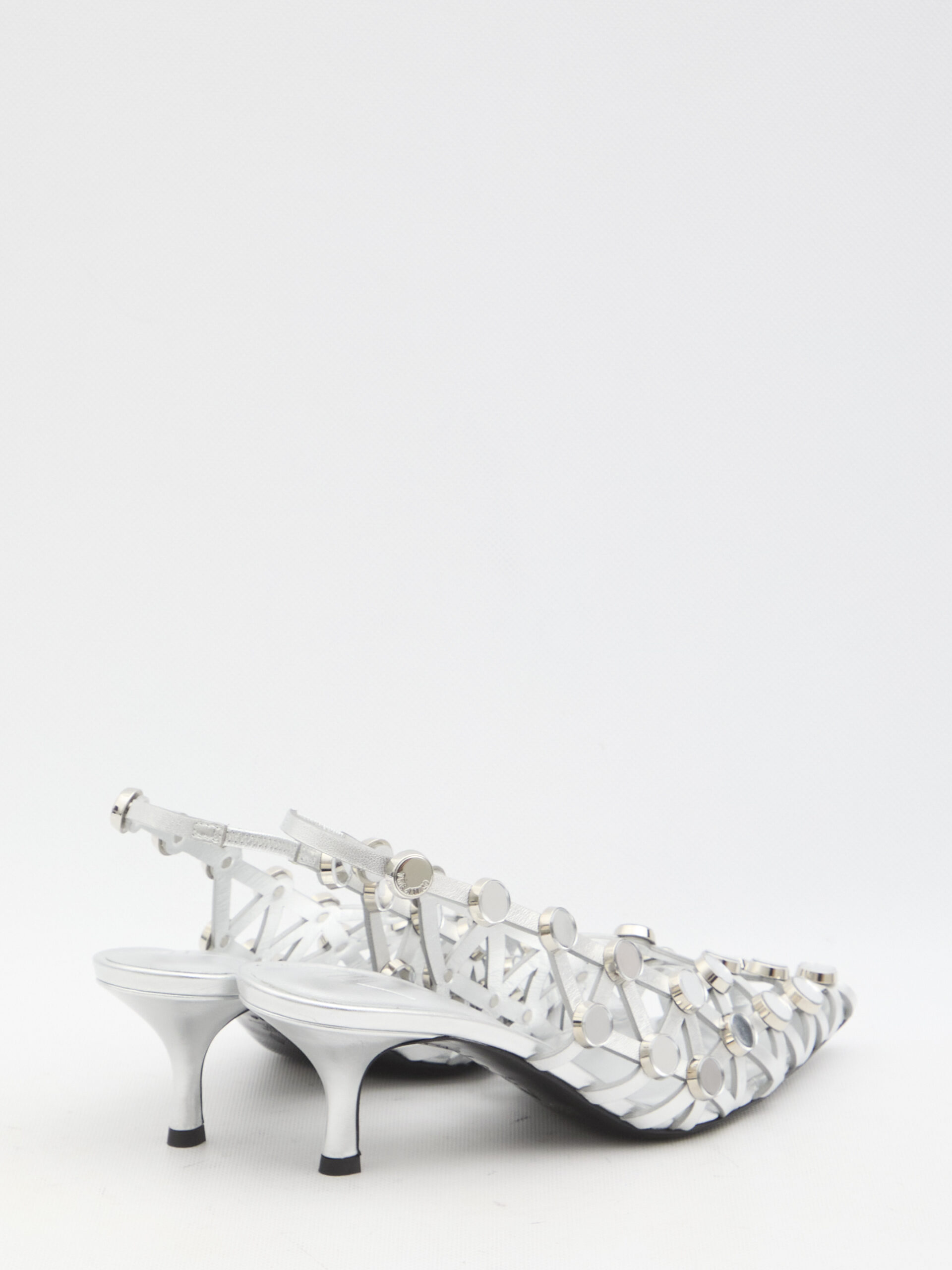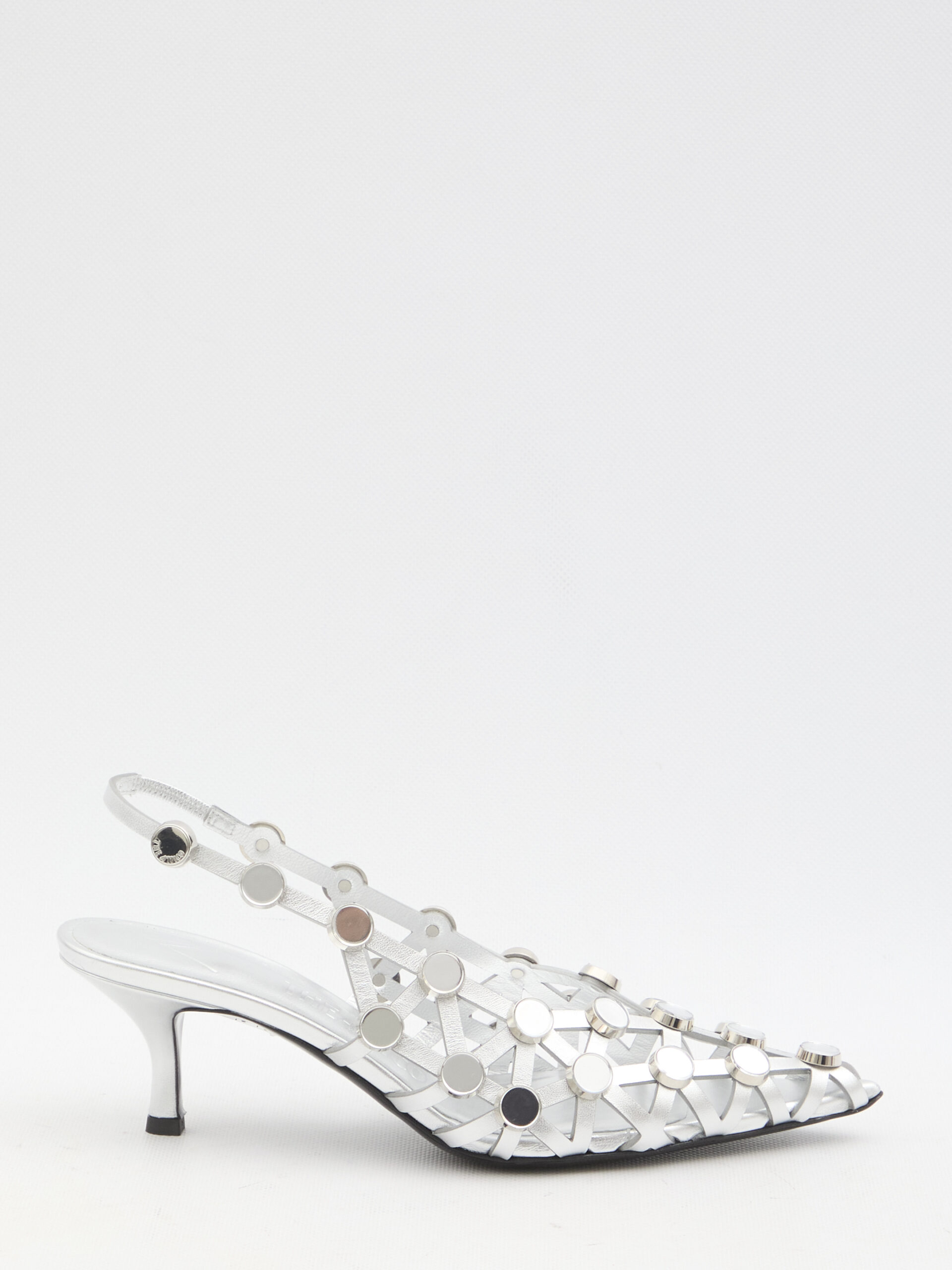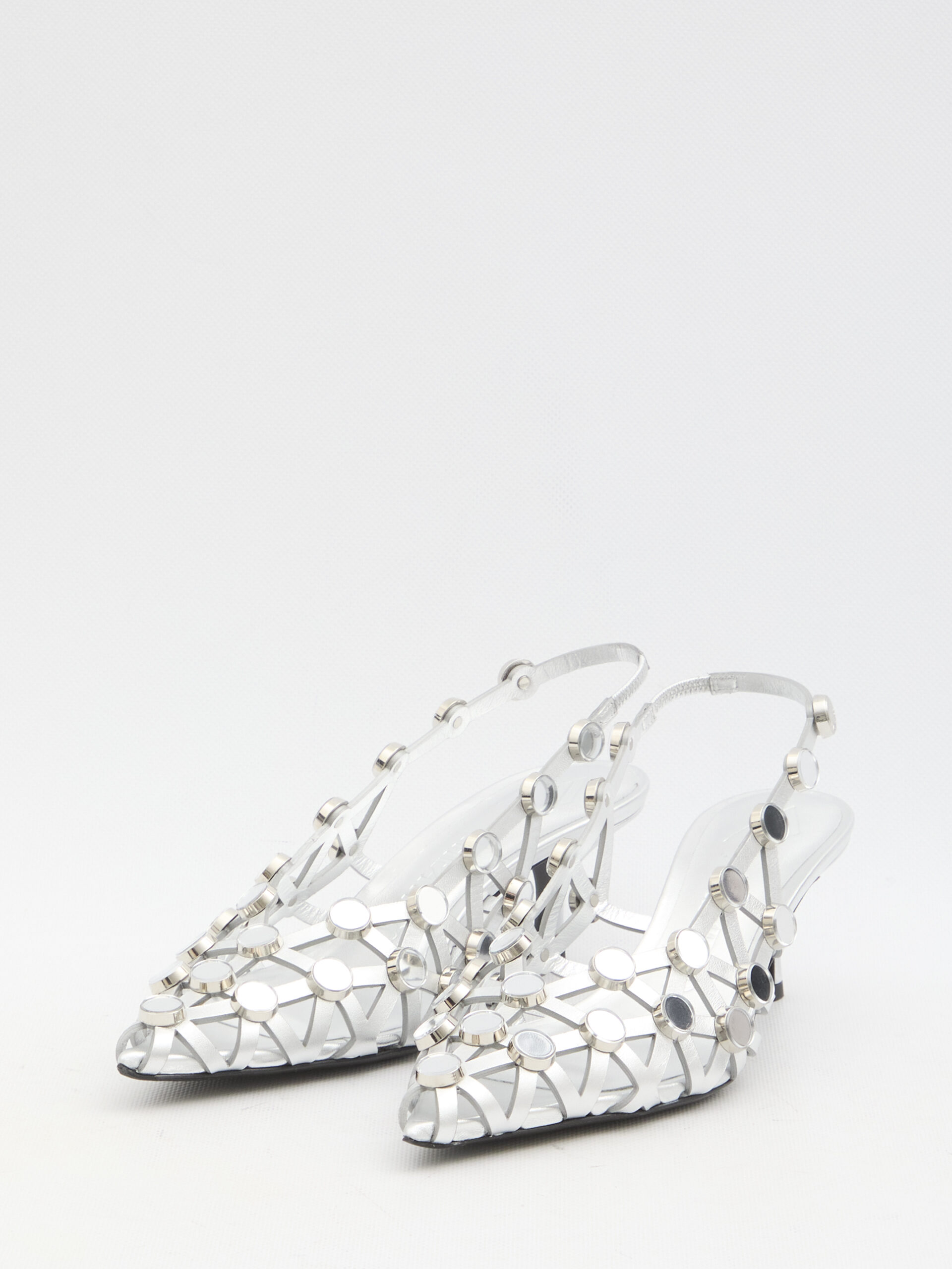 Grid slingback pumps in web silver metallic nappa leather with small silver mirrors. It features elasticated strap and stiletto heel. Dust bag included. Any leather imperfections are not to be considered manufacturing defects, but a peculiarity of the material.