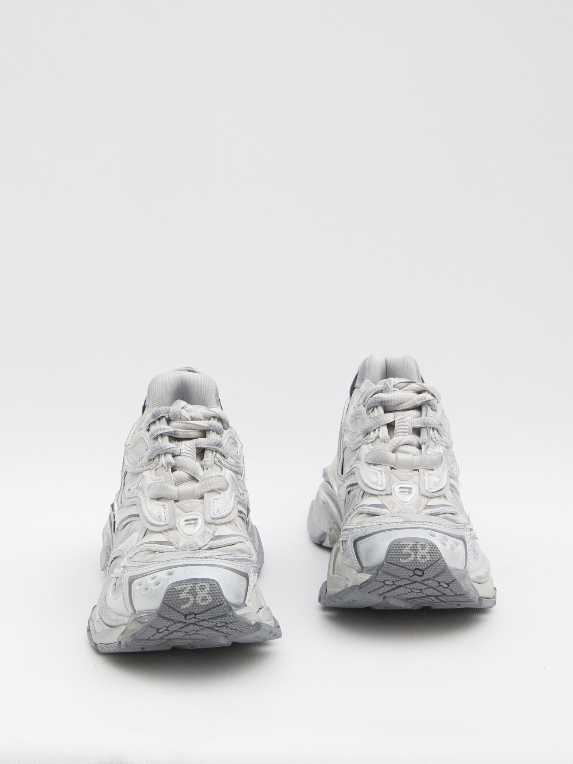 Sneakers in grey and silver nylon. Featuring printed size on the toe, embossed size on the back, printed Runner logo on the outer side, Balenciaga logo embossed on the tongue and back of the heel, and heel loop. Worn effect. Dustbag included.