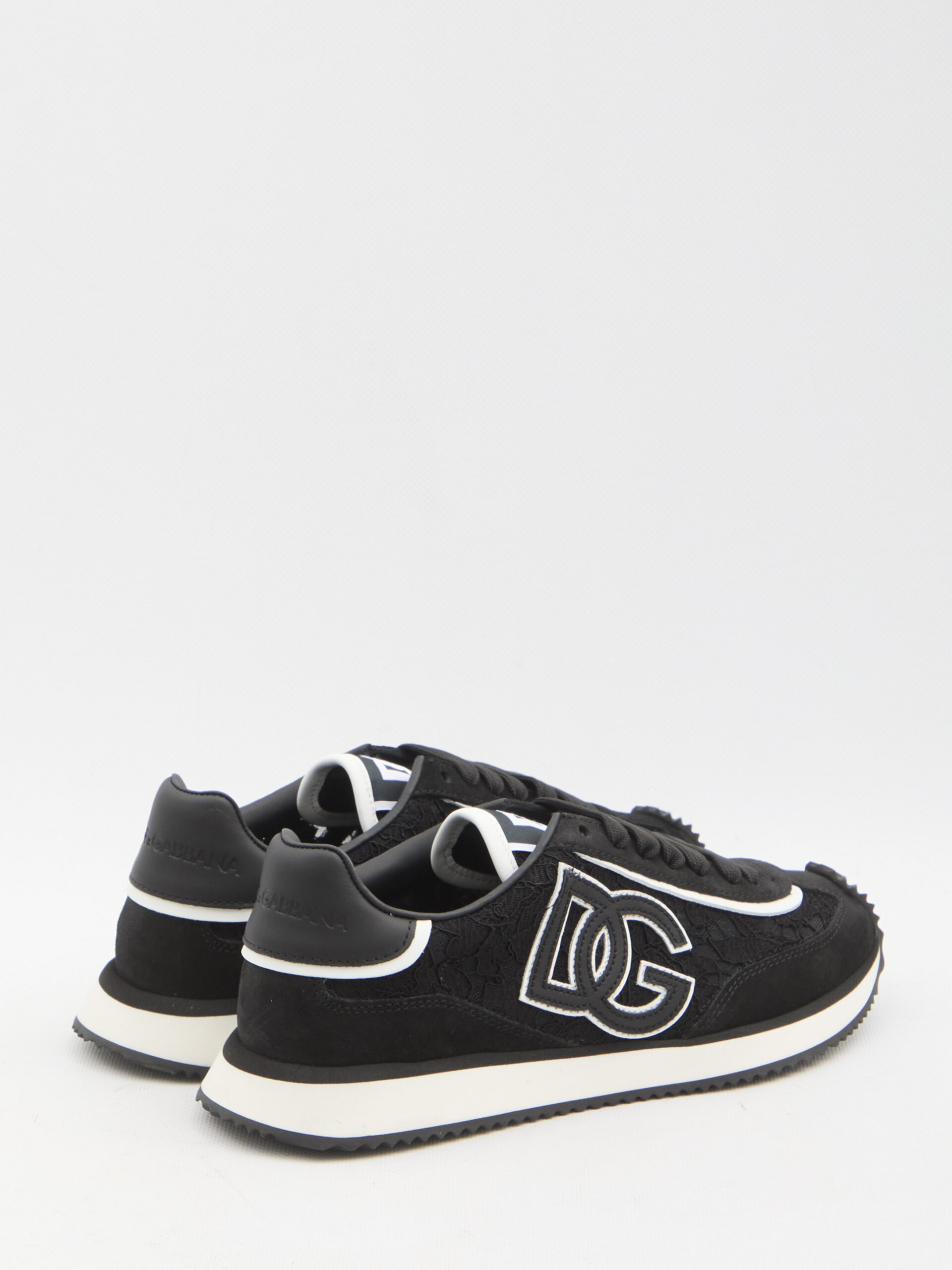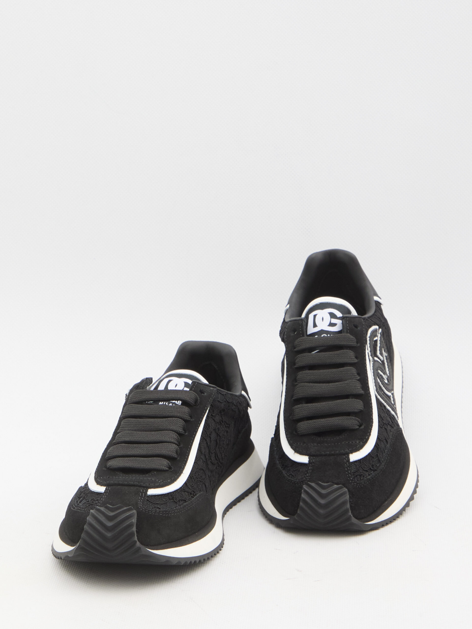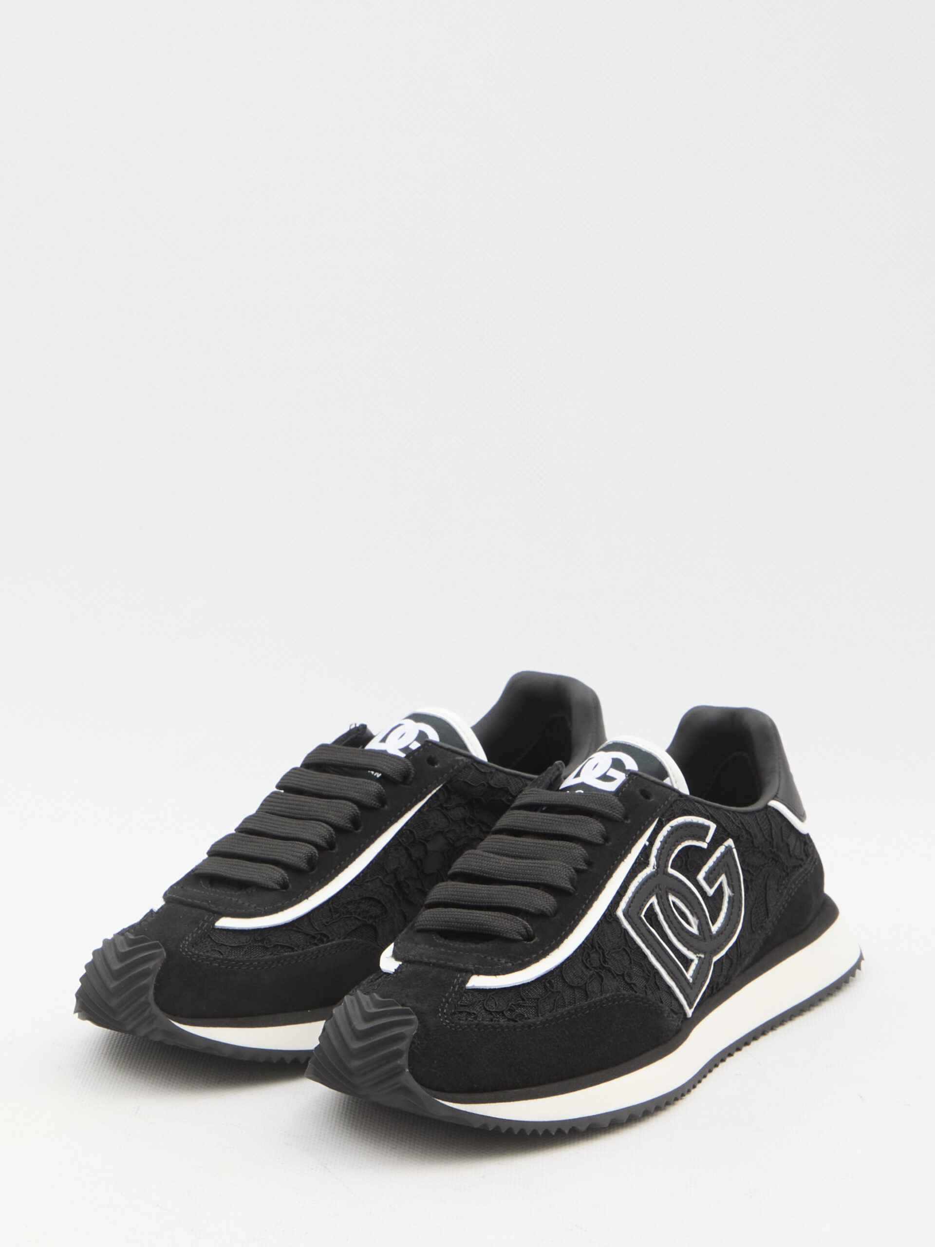 Sneakers DG Cushion in black and white suede, lace, and mesh. They feature lace-up fastening, DG logo on the tongue and side, Dolce & Gabbana logo embossed on the heel, and a rubber sole. Dust bag included. Any imperfections in the leather are not to be considered manufacturing defects but rather a characteristic of the material.
