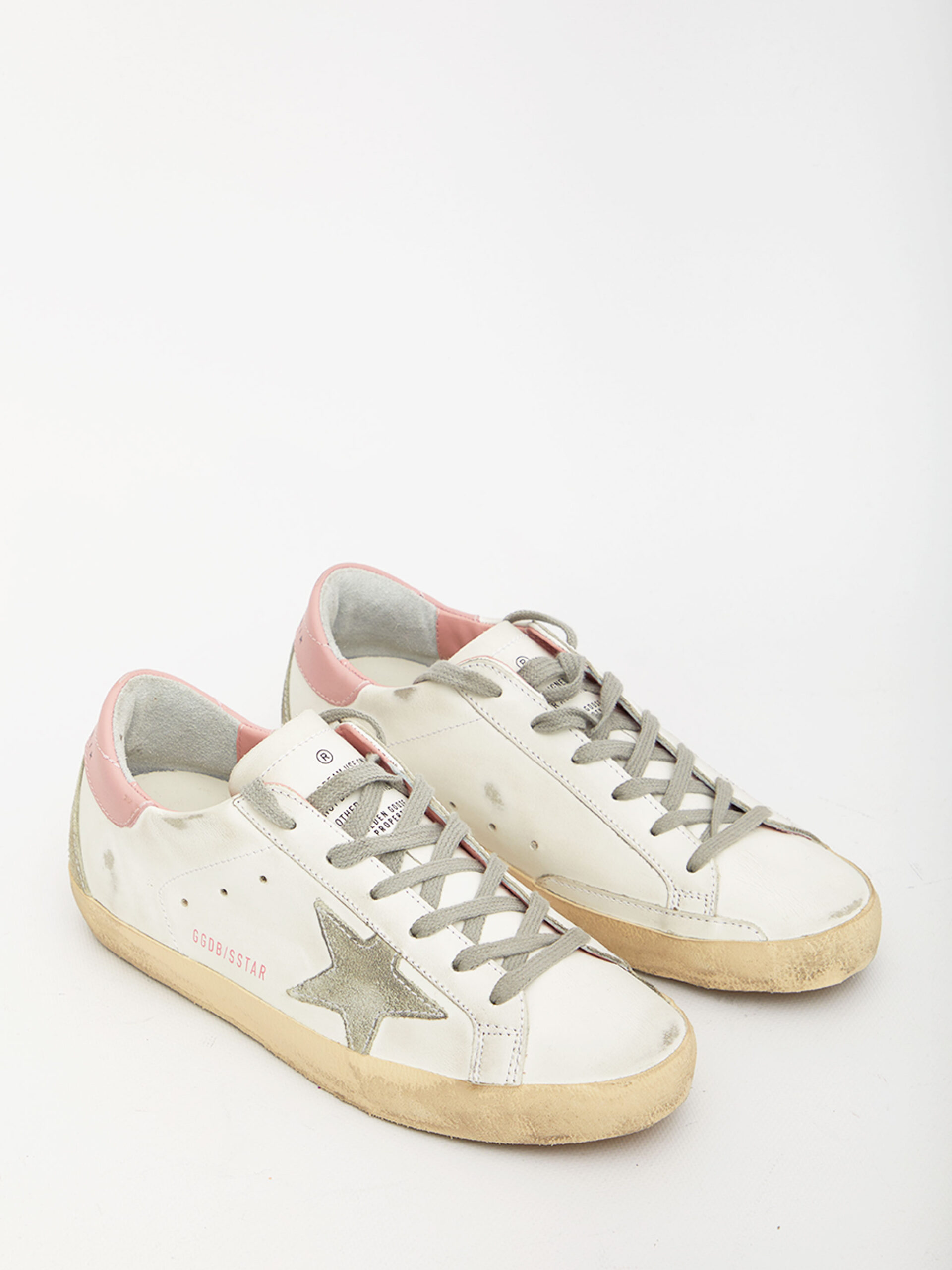 White leather Super Star sneakers with Golden Goose grey suede star side detail and pink heel with logo. They feature pink GGDB side lettering, suede details, round toe and vintage treatment.