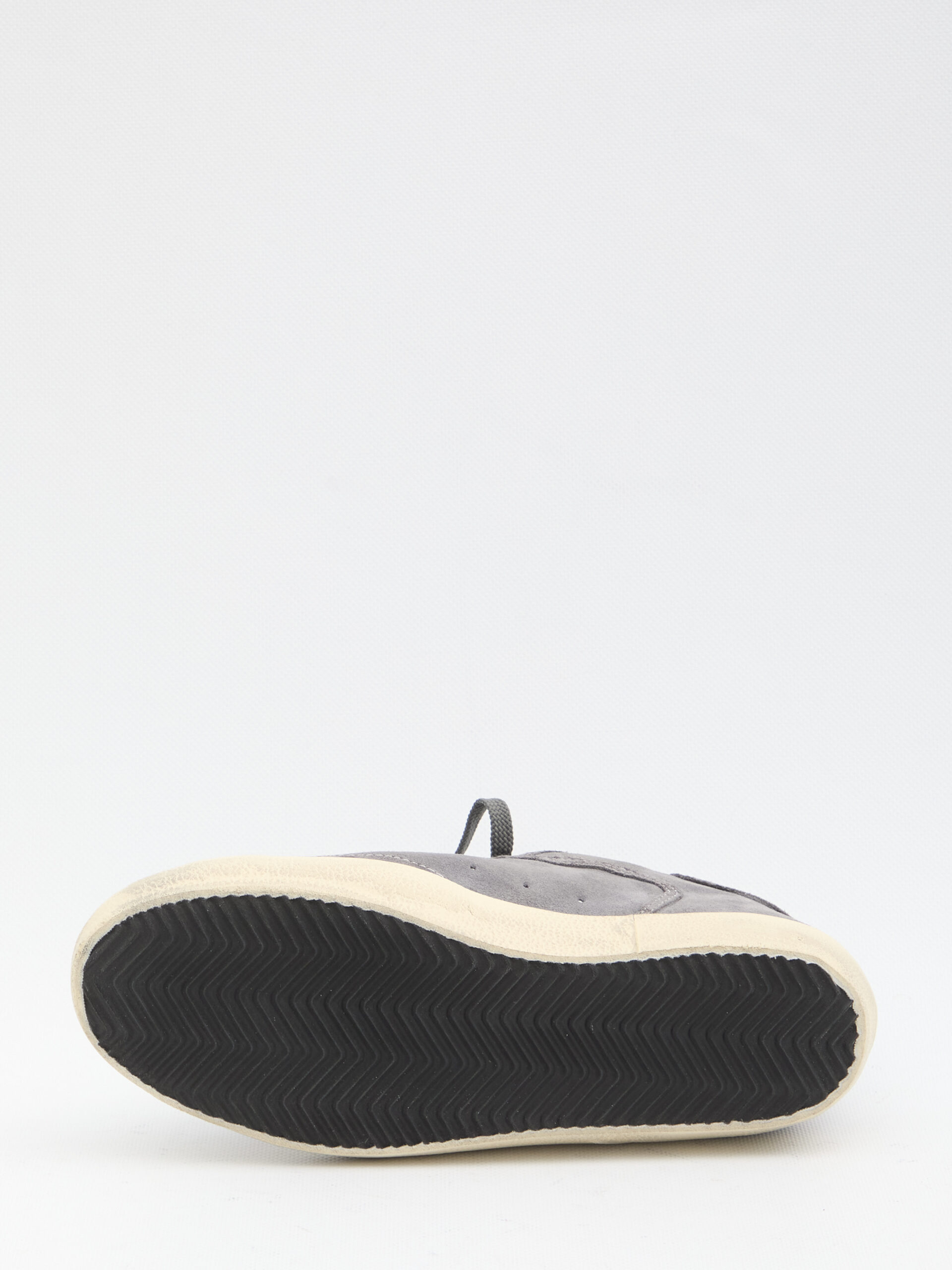 Suede sneakers in grey with a gunmetal glitter star. They feature a round toe, lace-up closure, a logo label on the tongue and a signature on the heel, leather interior, and a rubber sole. Vintage treatment. Dustbag included. Any natural imperfections in the leather are not manufacturing defects but a characteristic of the material.