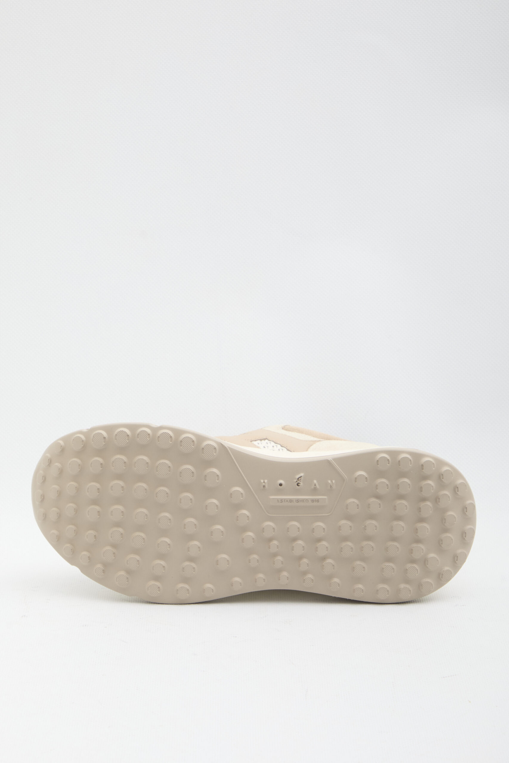 Ivory and beige suede and nabuk sneakers. Features rounded toe, lace-up closure, smooth leather side H, memory foam insole, Hyperlight rubber sole with studs. Dustbag and extra laces included. Any imperfections in the leather are not to be considered manufacturing defects but a characteristic of the material.