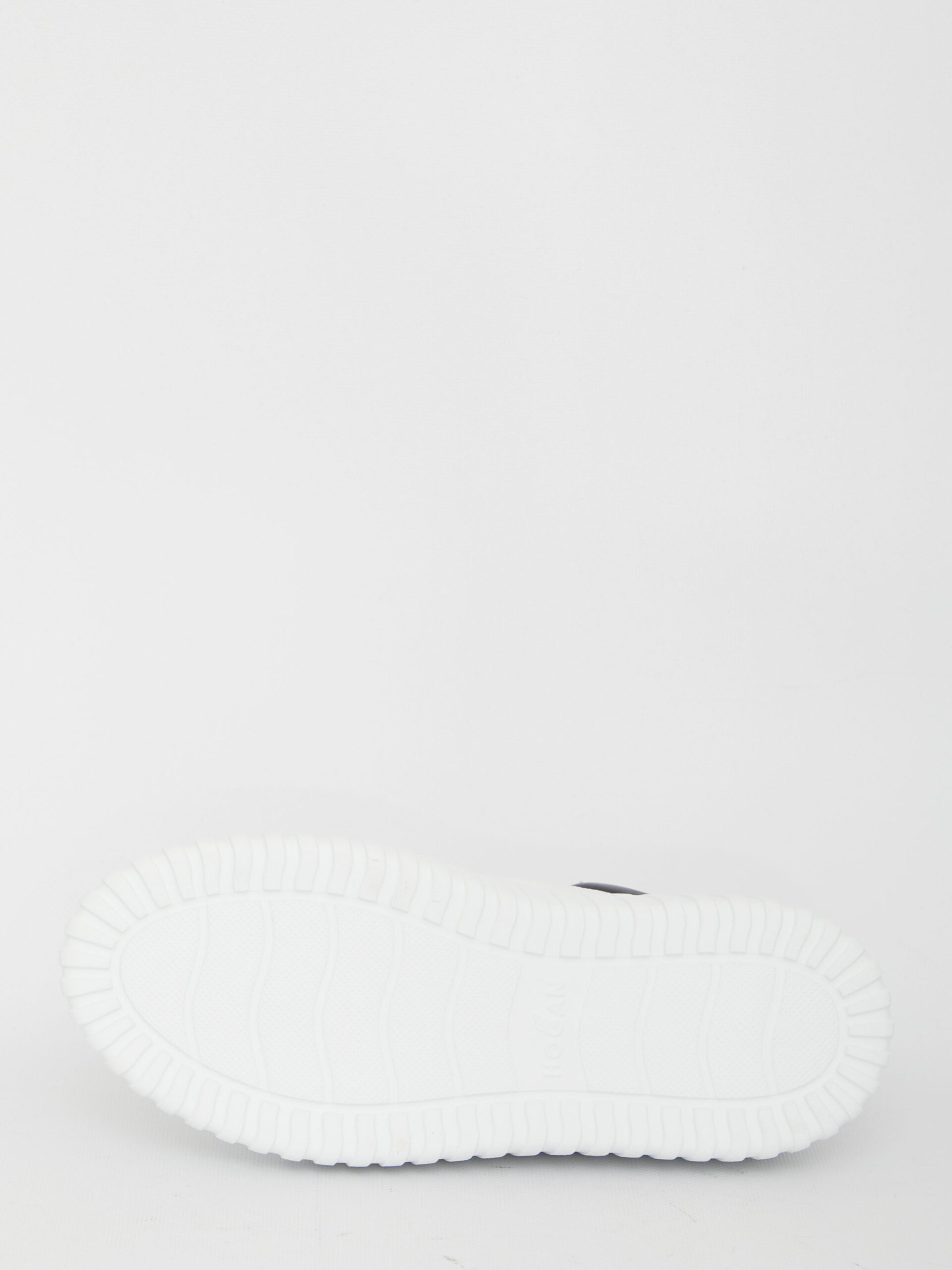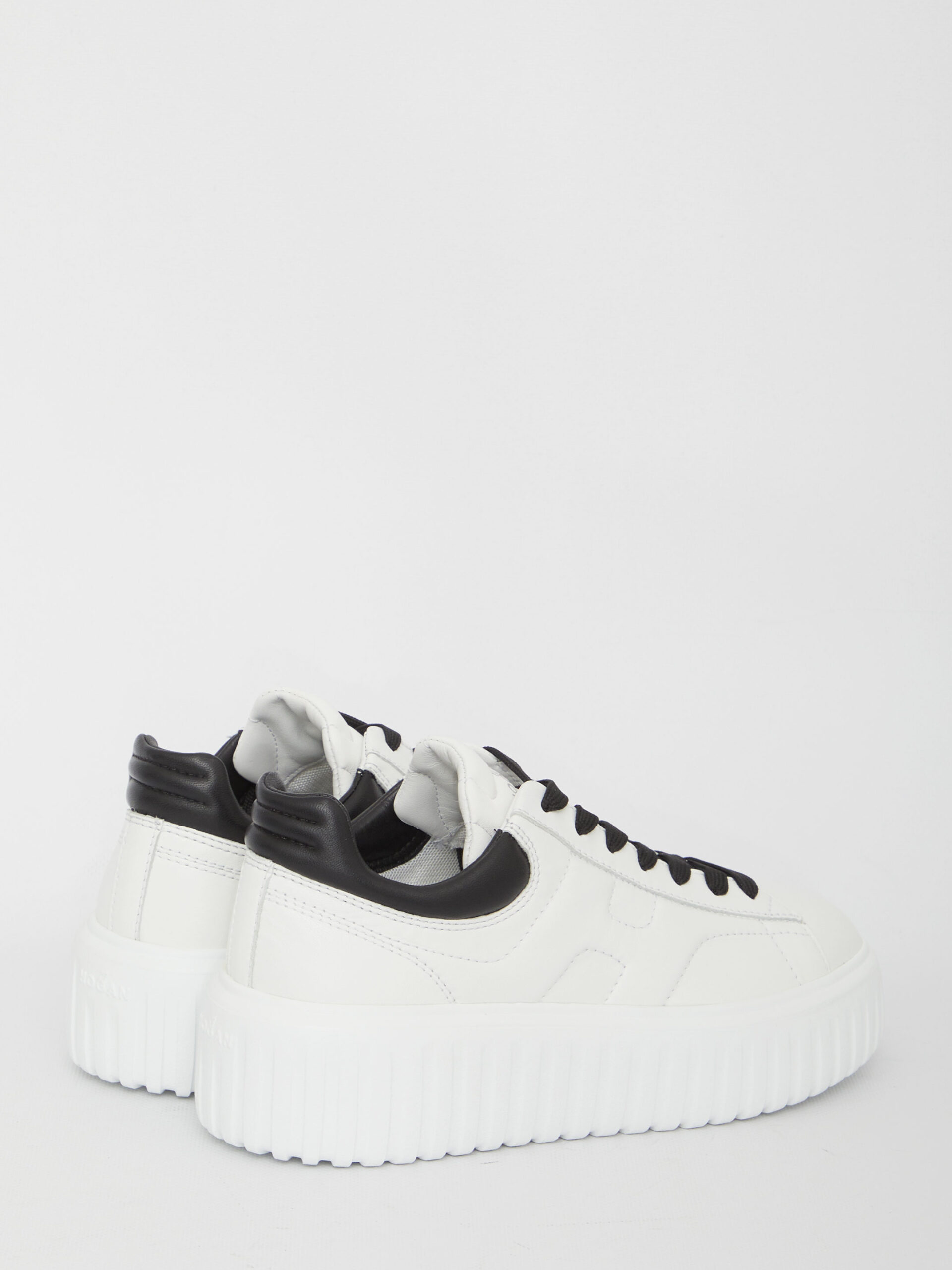Hogan H-Stripes sneakers in white and black nappa leather with side H band. Featuring an 8 mm memory foam insole, EVA sole with vertical stripes, and soft black heel tab. Any imperfections in the leather are not to be considered manufacturing defects, but rather a characteristic of the material.