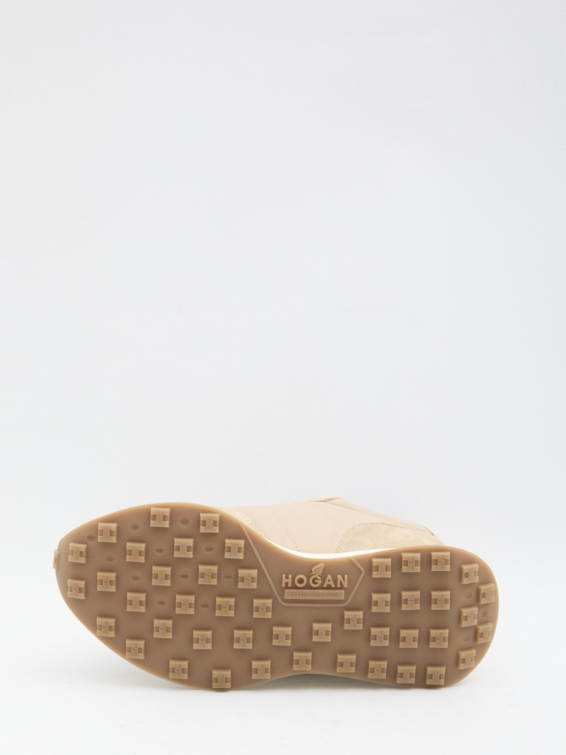 Sneakers in beige suede with inserts and a lateral H in nubuck. They feature a round toe, lace-up closure, a leather patch on the tongue with the Hogan signature, a burgundy leather H insert, a memory foam insole, and a rubber sole. Dustbag and extra laces included. Any natural imperfections in the leather are not manufacturing defects but a characteristic of the material.