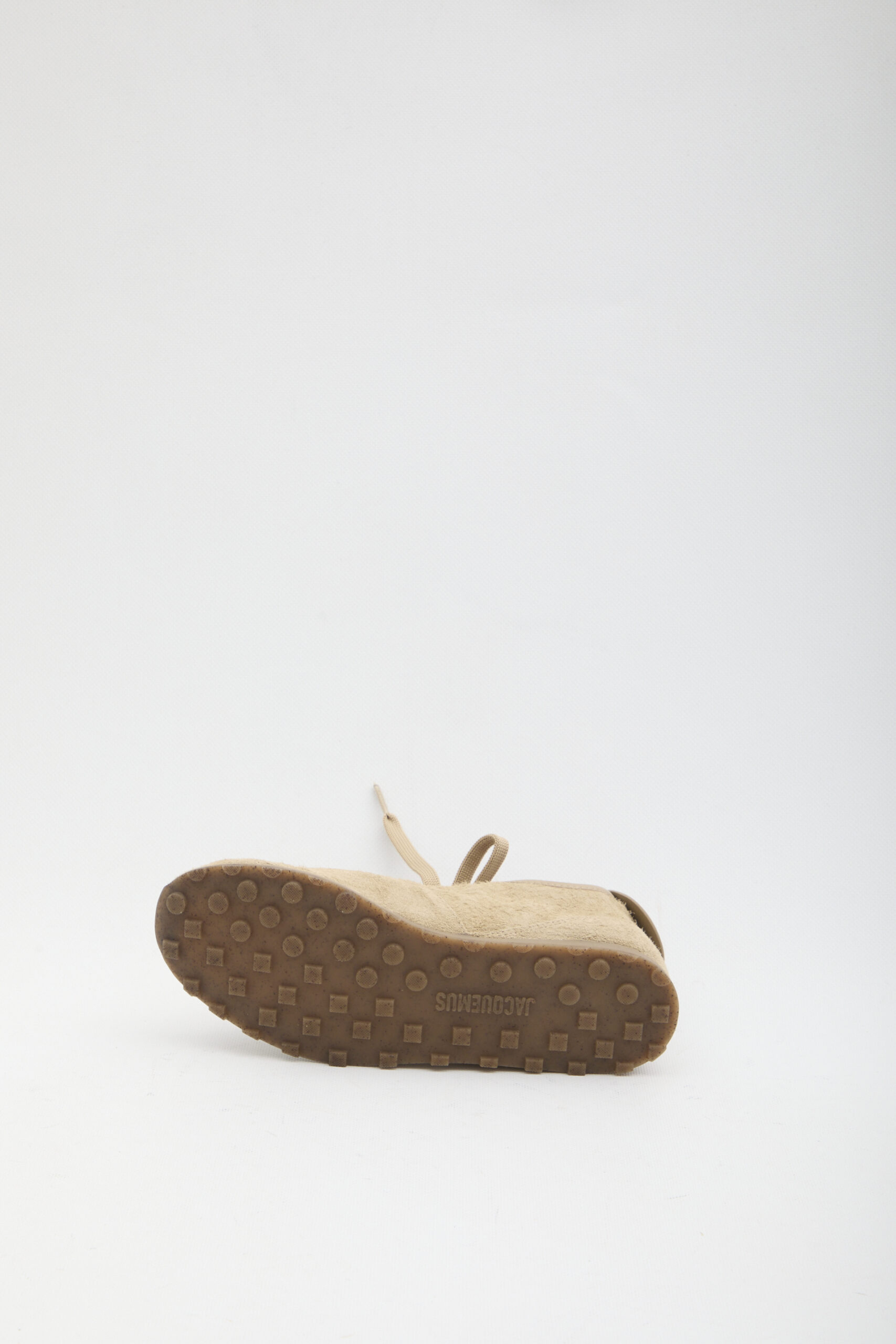 Dark beige suede leather sneakers. Feature an almond toe, lace-up closure, tongue with debossed Jacquemus signature, smooth leather insert with Jacquemus signature on the back, orange leather interior, TPU sole. Dustbag included. Any imperfections in the leather are not to be considered manufacturing defects, but a characteristic of the material.